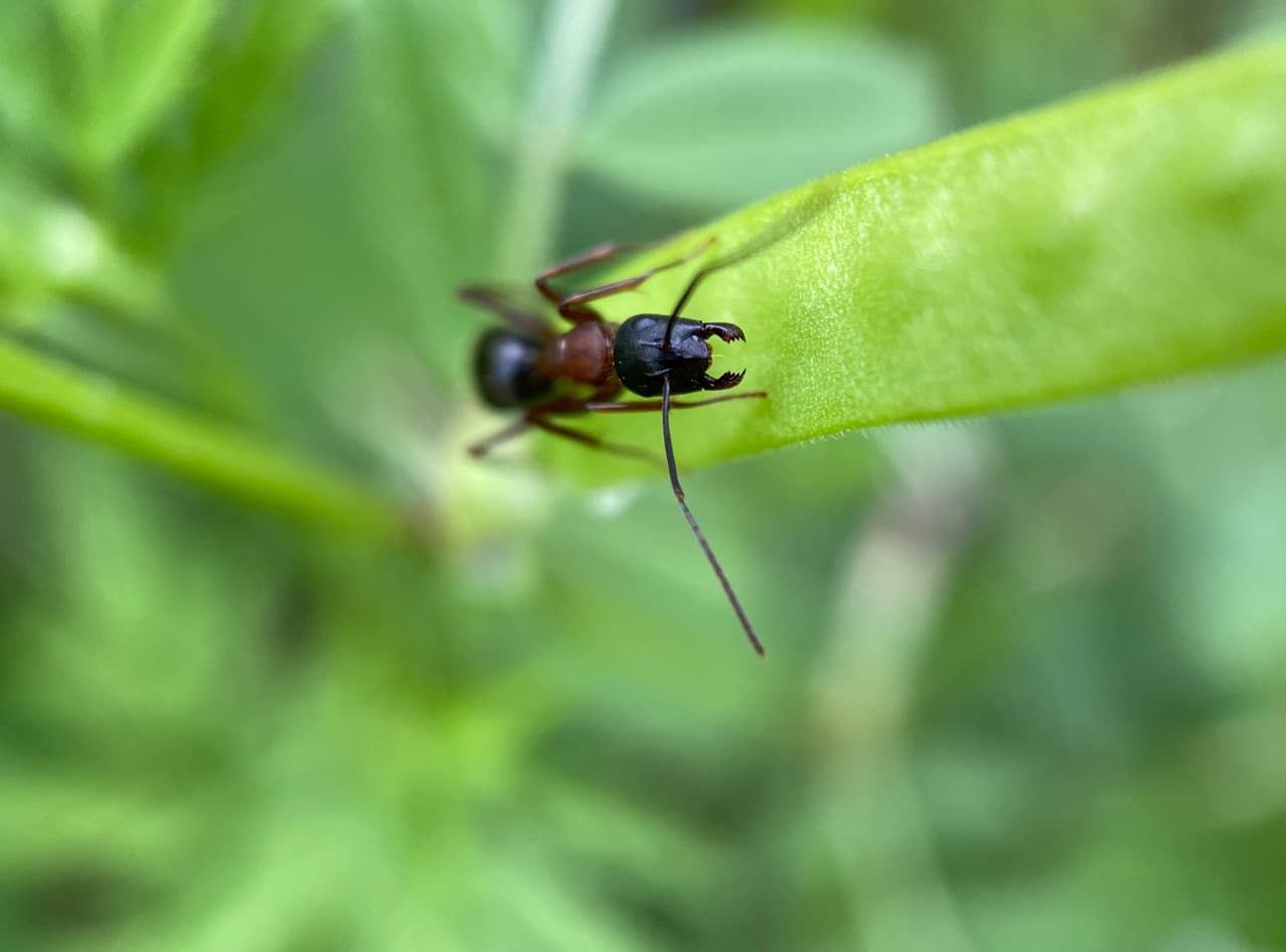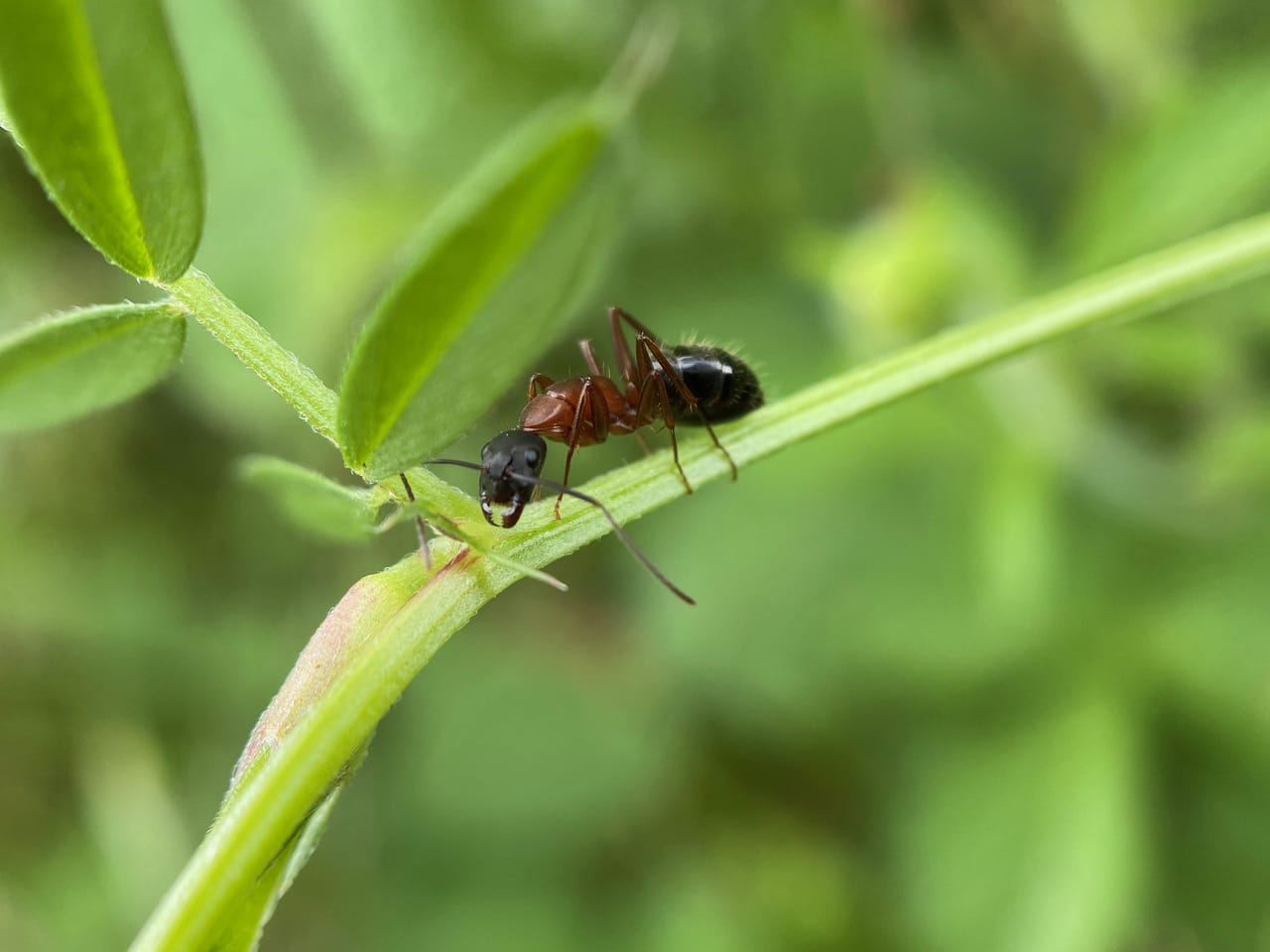The ant next climbs up a pea pod of the Common Vetch. Wow, check out those formidable mandibles! It is a Carpenter Ant in the genus Camponotus (family Formicidae).