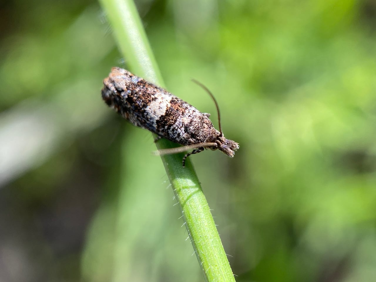 A small, mottled moth lands on a weedy stem and folds its wings. It is a member of the family Tortricidae, commonly known as tortrix moths or leafroller moths. Many are