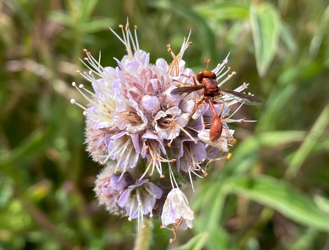 A chill runs down my spine as I spot this wasp-like fly lurking on a Phacelia inflorescence. The Thick-headed Fly, Physocephala burgessi (family Conopidae) is on the hunt for bumble bees!