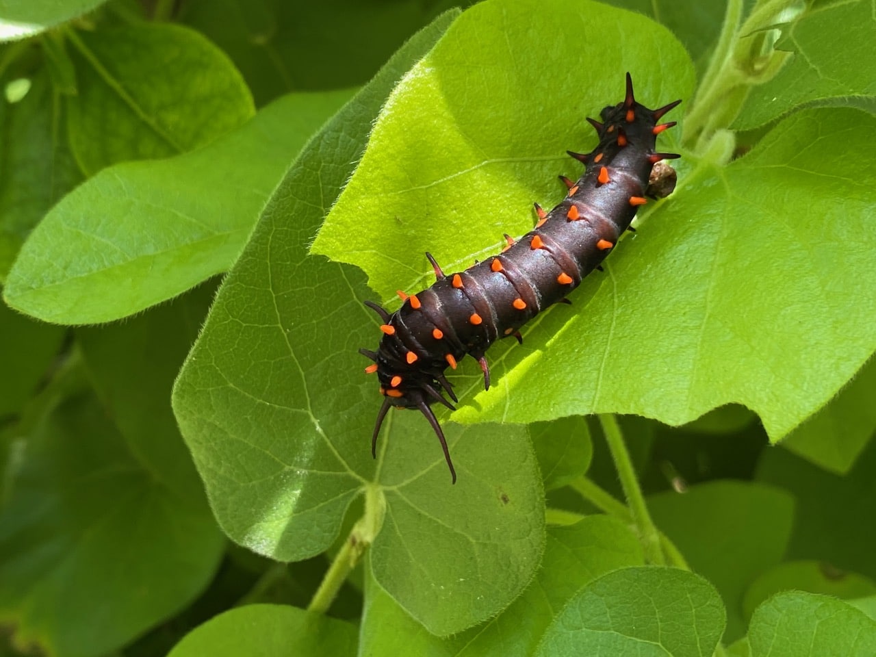 The conspicuous contrasting colors of the caterpillar send a warning signal to any potential predators, “Eat me at your own peril!”. The leaves of California Pipevine that the caterpillars feed on contain aristolochic acid which is poisonous. The Pipevine Swallowtail caterpillars are immune to the poison, and they actually sequester the poison in their own bodies for self defense.