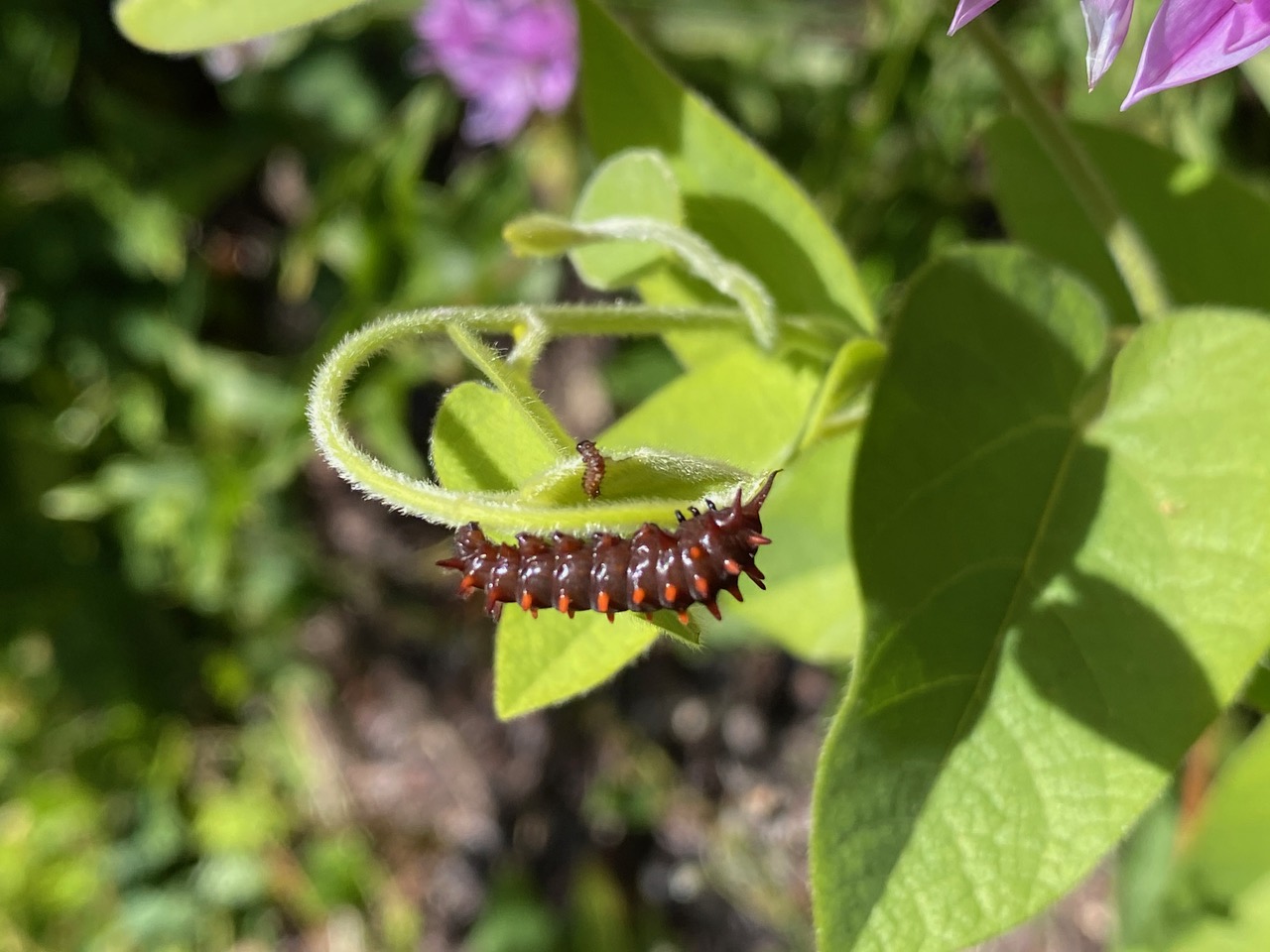 An older caterpillar is feeding on a terminal leaf of California Pipevine alongside a very young caterpillar. The size difference is remarkable.