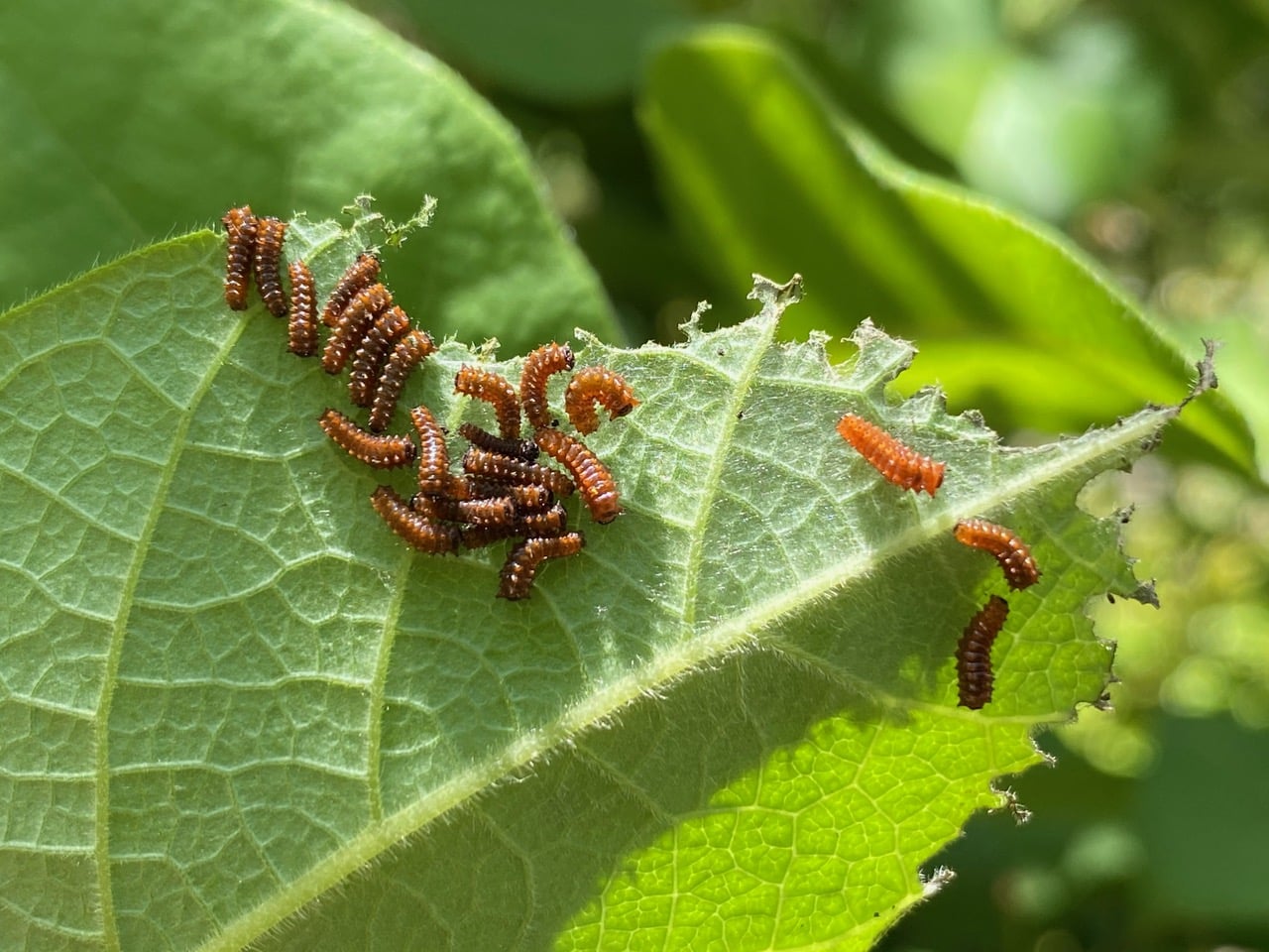 New batches of Pipevine Swallowtail eggs have hatched on underside of the leaves of California Pipevine, Aristolochia californica. The youngest caterpillars tend to feed in aggregations on the edges of the leaves.