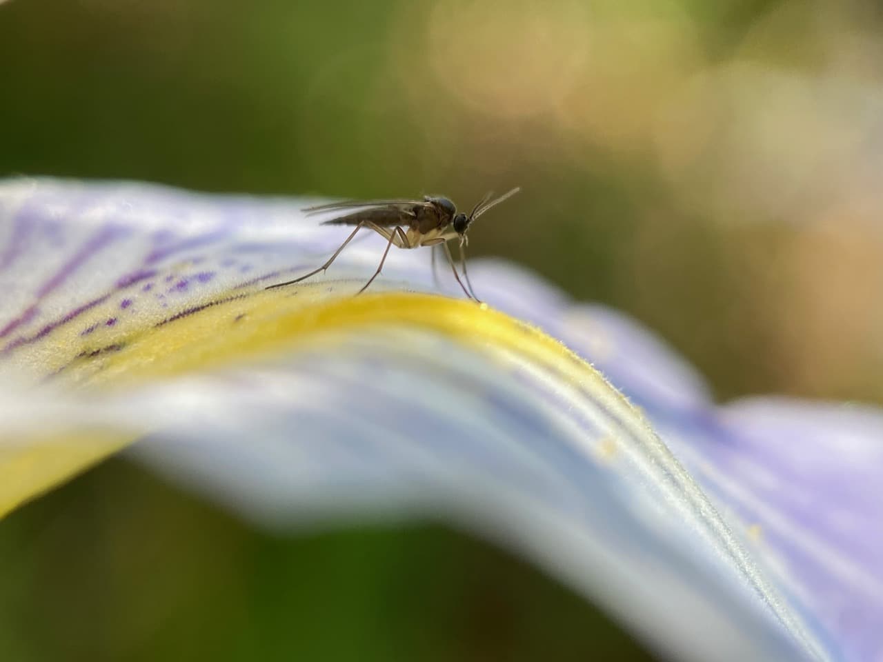 A Fungus Gnat (family Mycetophilidae) is perched on a sepal of Douglas Iris. Insects, including bees, that are too small to make contact with the stigma of the flower are not likely to pollinate it.