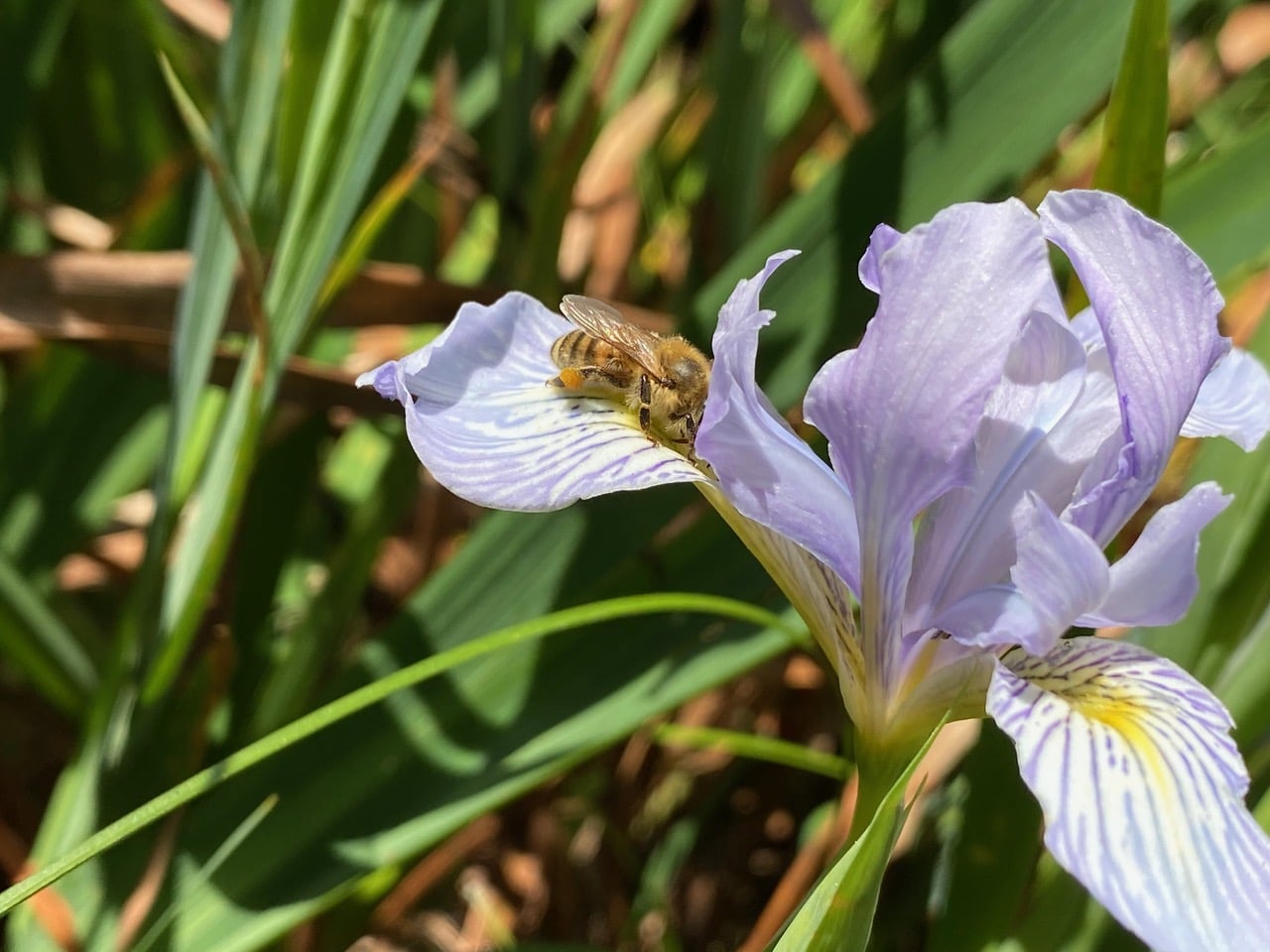 Guided by the nectar guides on a sepal of a Douglas Iris, a Honey Bee, Apis mellifera (family Apidae) is descending the corridor that is created by the sepal and the petaloid style above it. The petaloid style is a style that resembles a petal. So where is the stigma? It is situated on the style near the bee’s head in this picture.