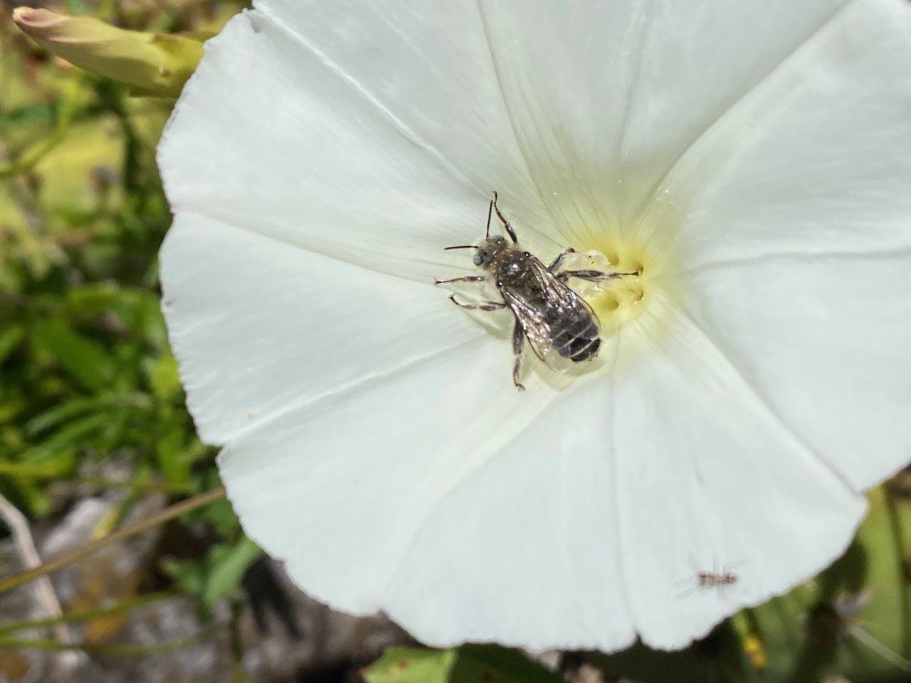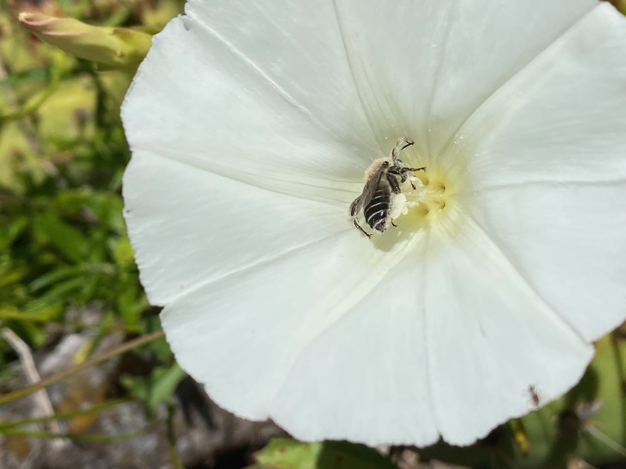 A few fast-flying bees keep coming back to the flowers of the Morning Glory. Waiting by a flower, I finally get a picture of one of them as she lands on the stamens.