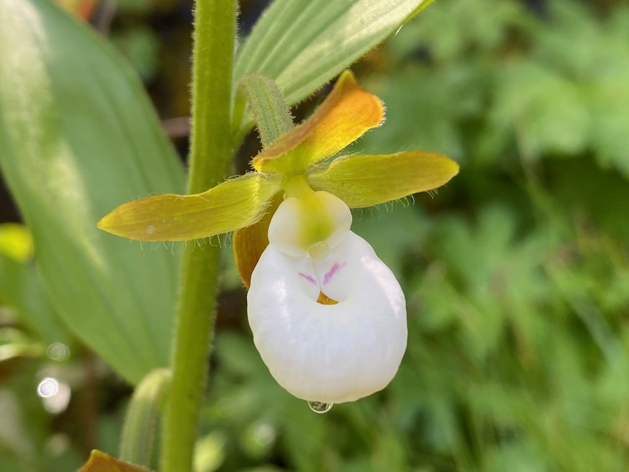 The California Lady’s Slipper Orchid, Cypripedium californicum is in peak bloom, with oddly shaped flowers hanging like little white lanterns on erect stalks.