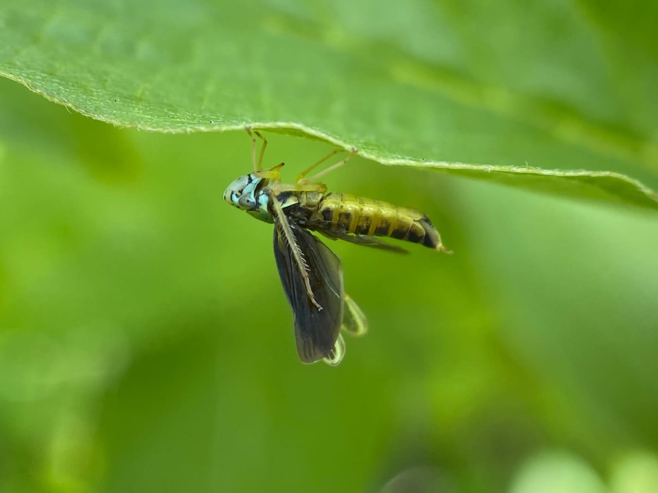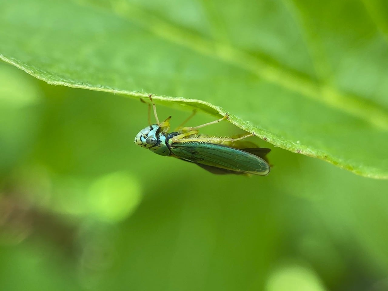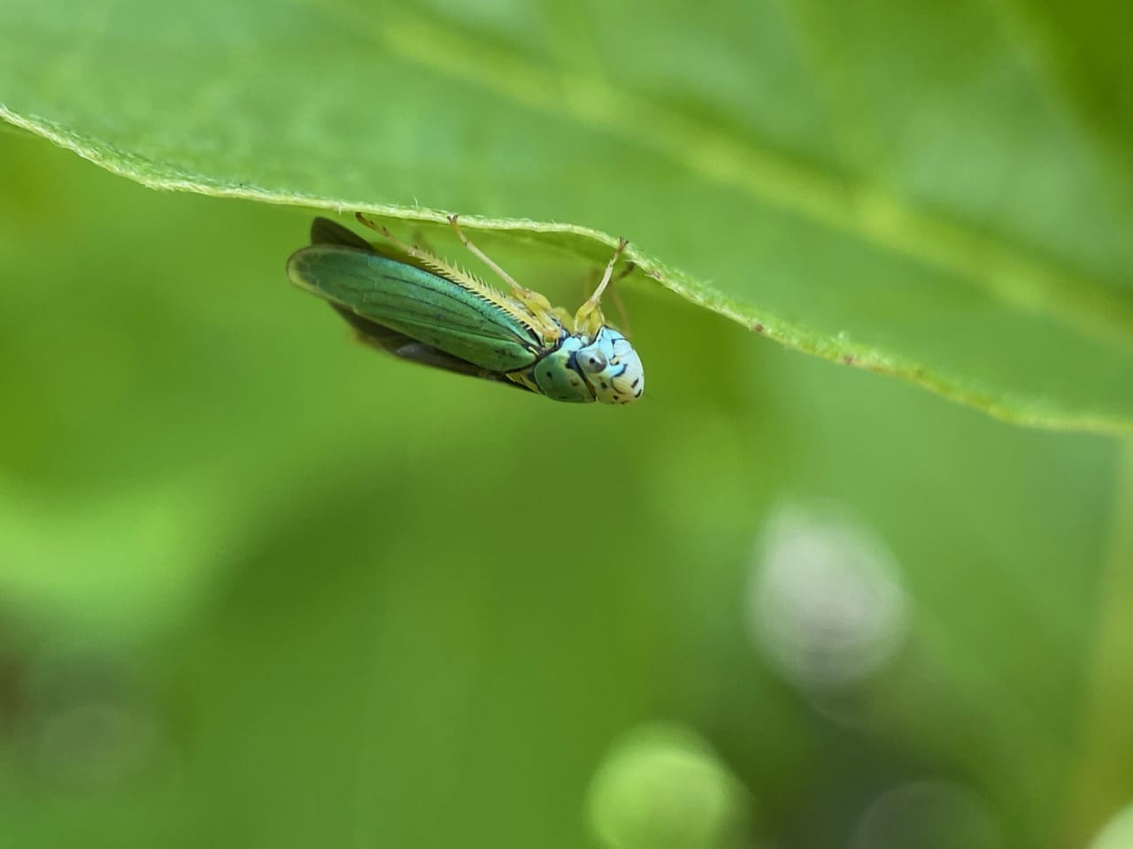 Moving over to the edge of the leaf, the Sharpshooter hangs upside-down and tries to groom and rearrange its wings using its long hind legs with the characteristic comb-like spines that define the family Cicadellidae.