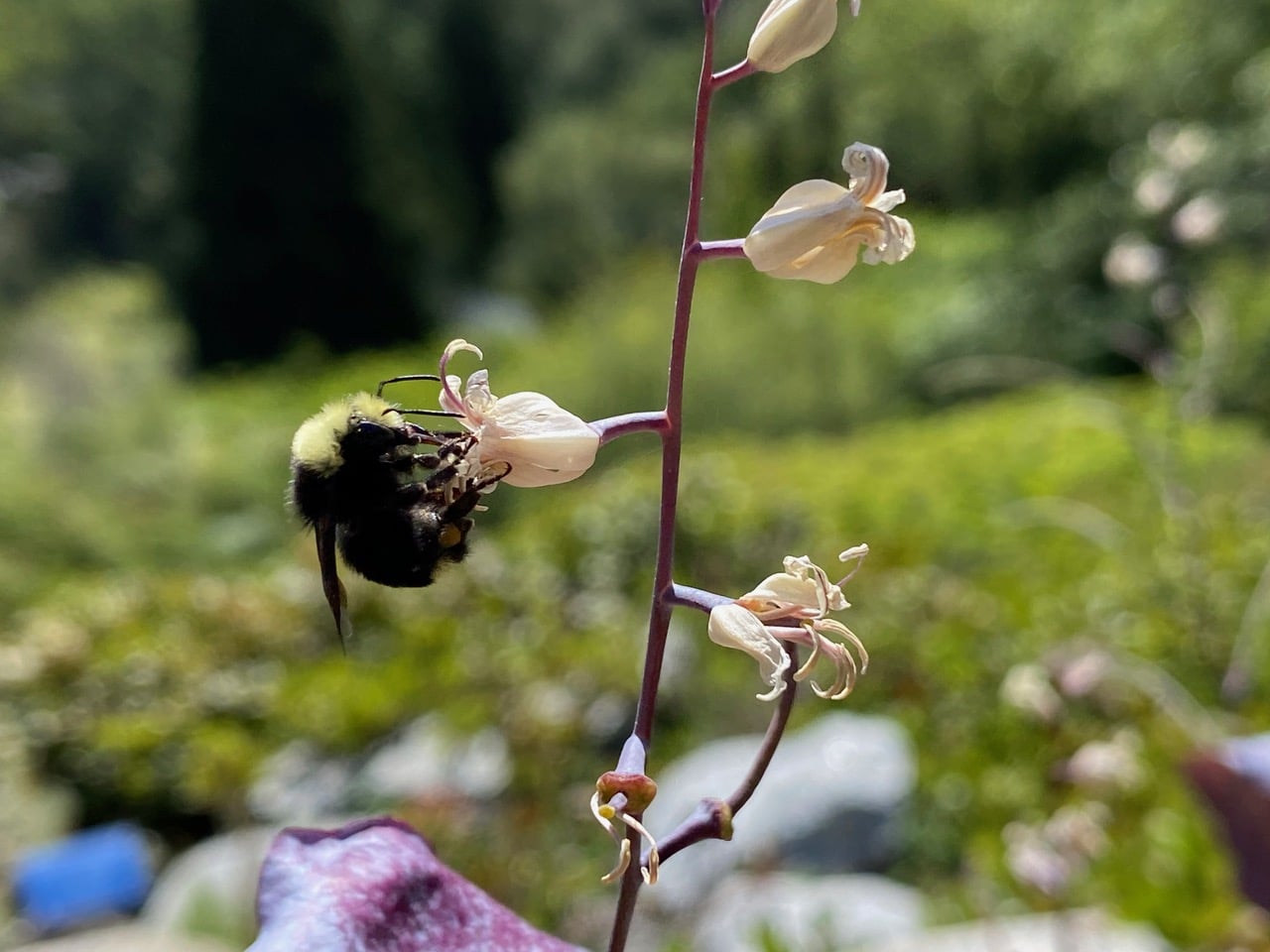 A Yellow-faced Bumble Bee lands delicately on the small flower of Farnsworth Jewelflower and probes for nectar with her long tongue. I wonder what other insects serve as pollinators for this flower in its natural habitat in the Sierra foothills.
