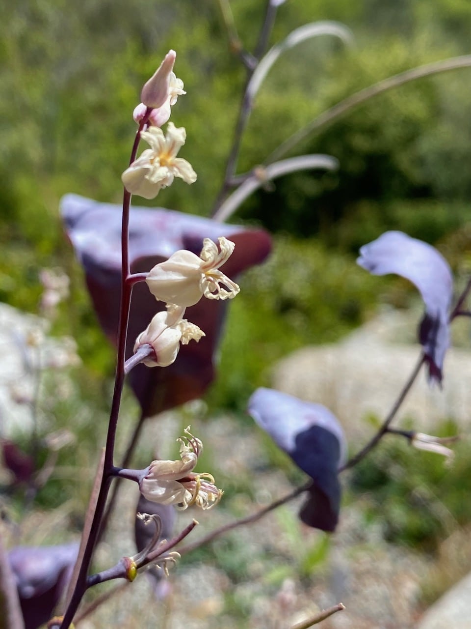 The species is endemic to California, where it is limited to the woodlands of the Sierra Nevada foothills. It is an annual herb producing a hairless, waxy, purple stem up to half a meter tall or more. Flowers occur at intervals along the upper stem with one or two purple bracts at the base of the raceme. Each flower has an urn-shaped calyx. Curling purple-veined white petals emerge from the tip of the calyx.