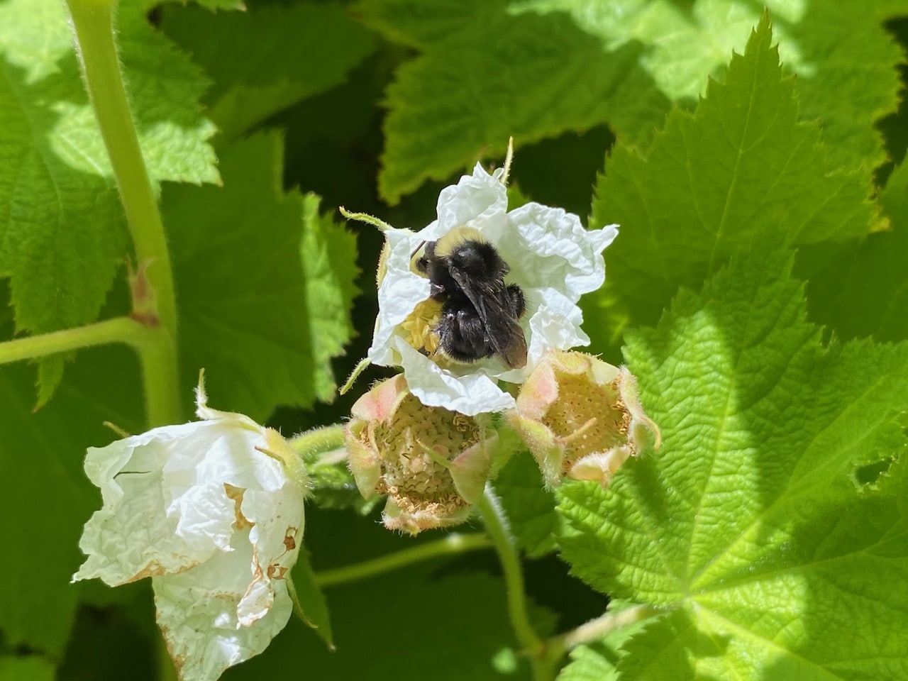 Yellow-faced Bumble Bees, Bombus vosnesenskii (family Apidae) are seeking out the last few flowers on the Thimbleberry.