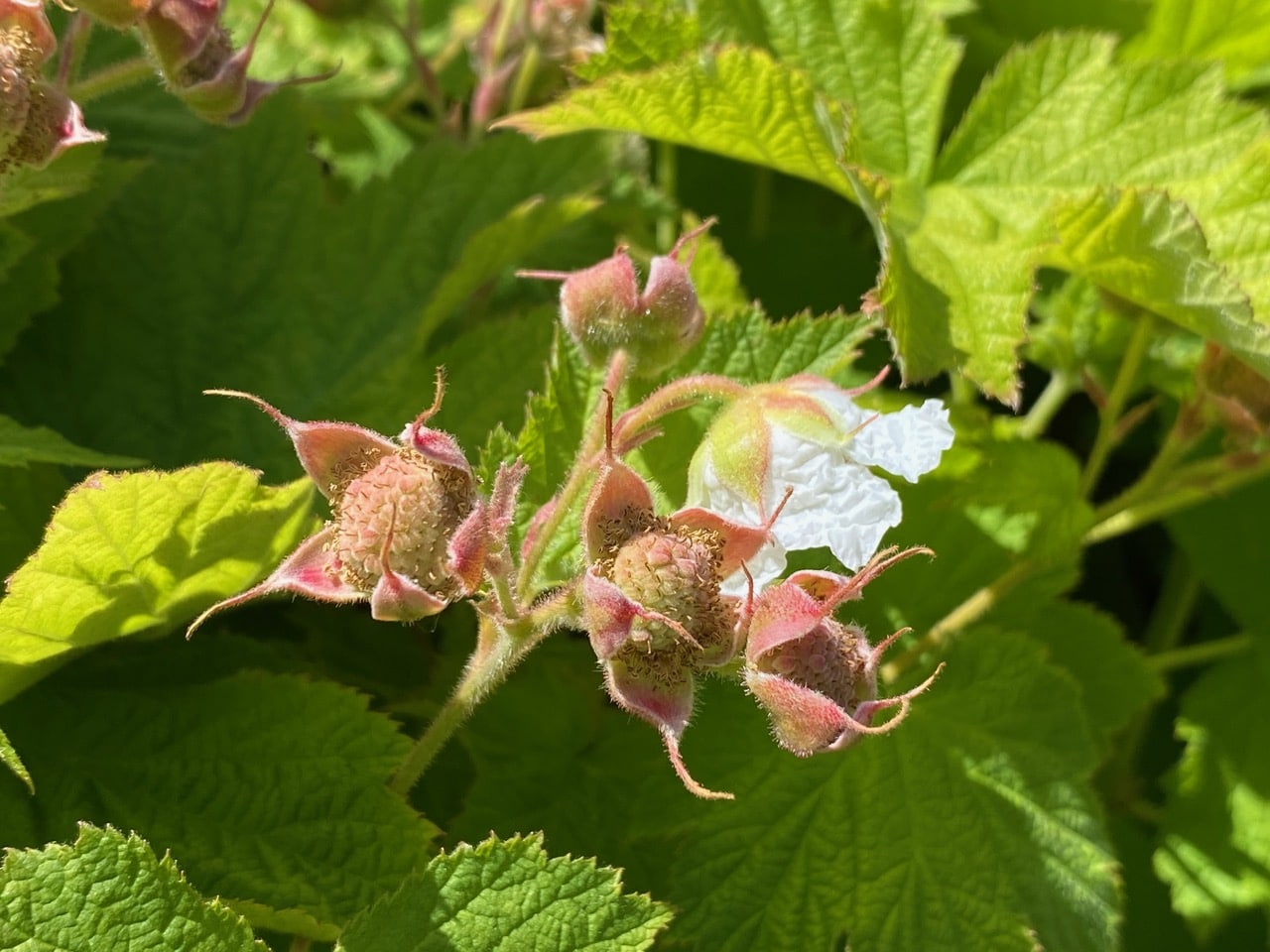 TheThimbleberry, Rubus parviflorus is approaching the end of its bloom. Most flowers are gone, replaced by pinkish fruits in darkening calyces.
