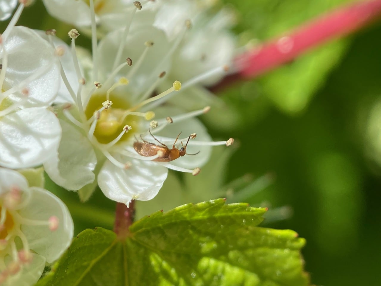 A False Flower Beetle (family Scraptiidae) is foraging for pollen on a flower of Pacific Ninebark, Physocarpus capitatus.