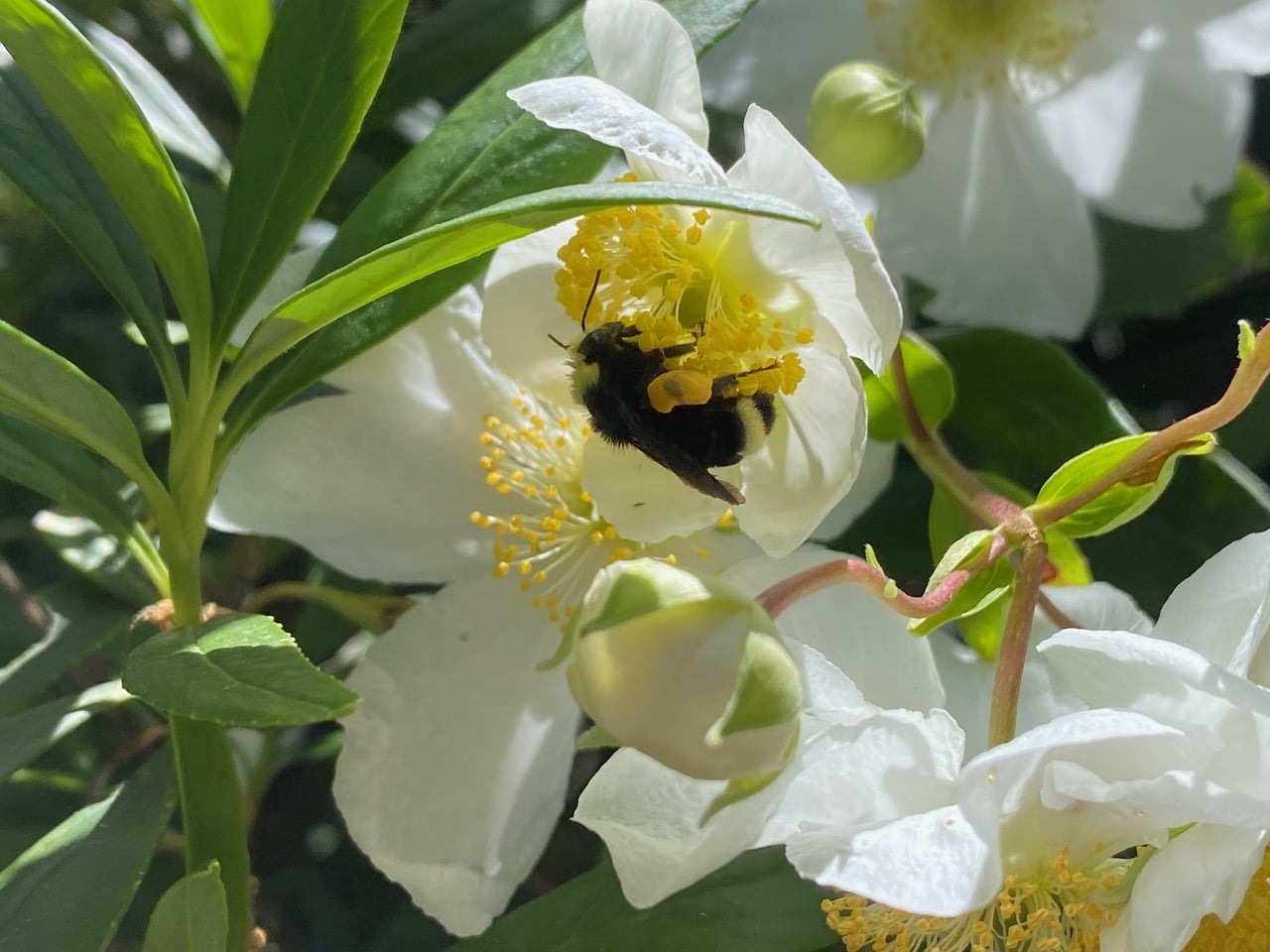 A Yellow-faced Bumble Bee, Bombus vosnesenskii (family Apidae) is collecting pollen from a flower of Bush Anemone, Carpenteria californica. There is so much pollen on those anthers on long filaments that all the bee has to do is run quickly through the stamens. The bee already has a sizable pollen load in her pollen baskets.