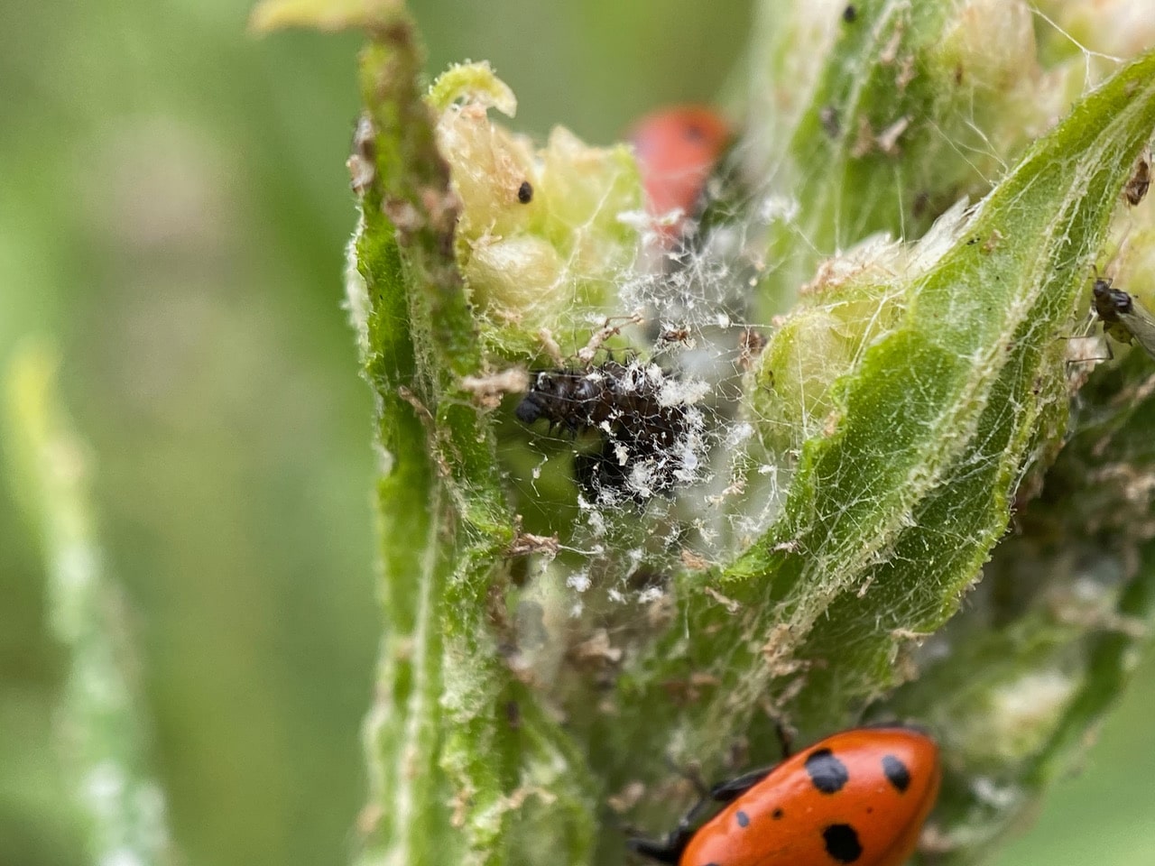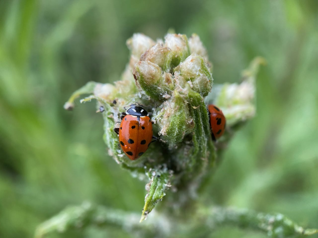 The third Convergent Ladybeetle is actively hunting aphids. If you squint hard enough, you might see the tiny green aphids among the flower buds.
