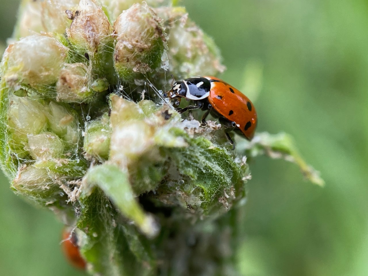 I wish I could shelter from the unrelenting winds like this Ladybeetle, snug as a bug!