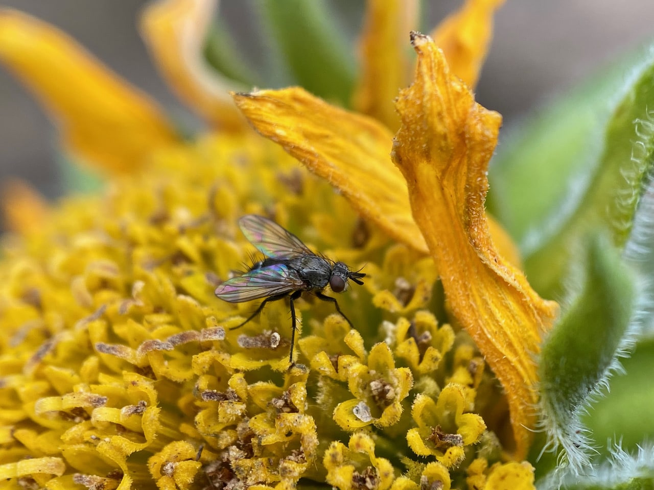 A small dark, bristly fly is sheltering from the winds on a fading flowerhead of the Mount Diablo Sunflower, Helianthella castanea.