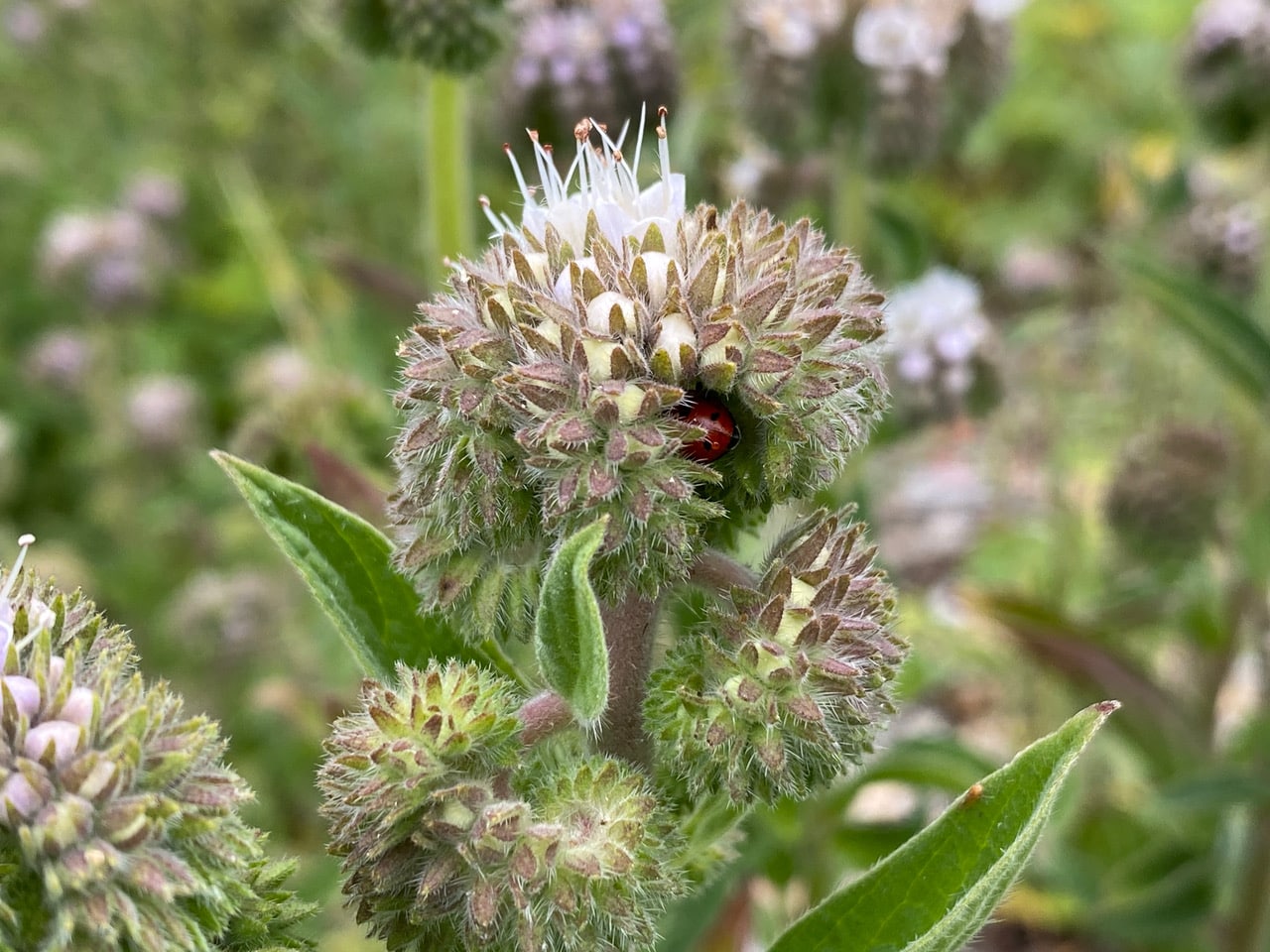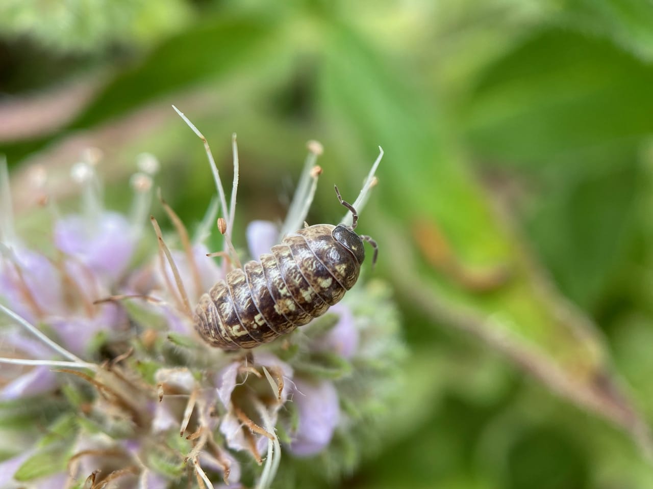Just inches away, on a lower inflorescence, another species, the Versicolored Pill Woodlouse, Armadillidium versicolor (family Armadillidiidae) is holding on to Phacelia stamens. Is it feeding on pollen?