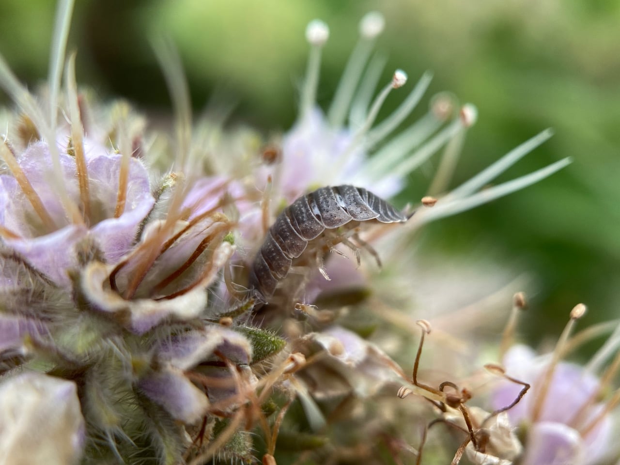 The woodlouse is diving deep into a phacelia flower, probably to drink nectar. I am tickled to see that it can hold its long, segmented body and hind legs up in the air.