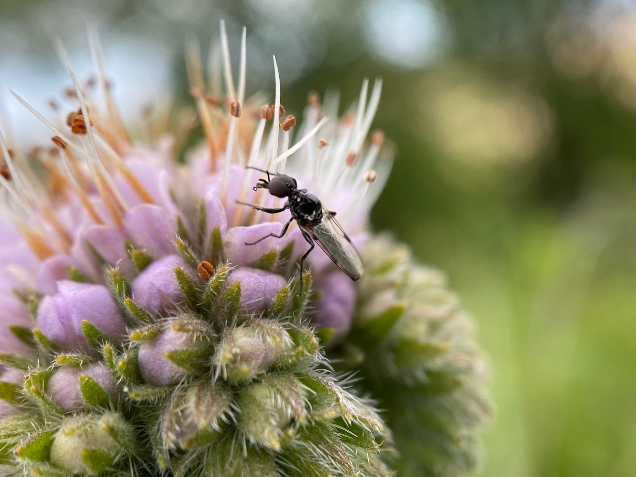 A male March Fly (family Bibionidae) is posing nicely on the phacelia flowers. Reviewing the photo on the big screen, I realize that it is dead! See the gaping hole on its thorax? What predator could cause this damage? Or internal parasitoids?