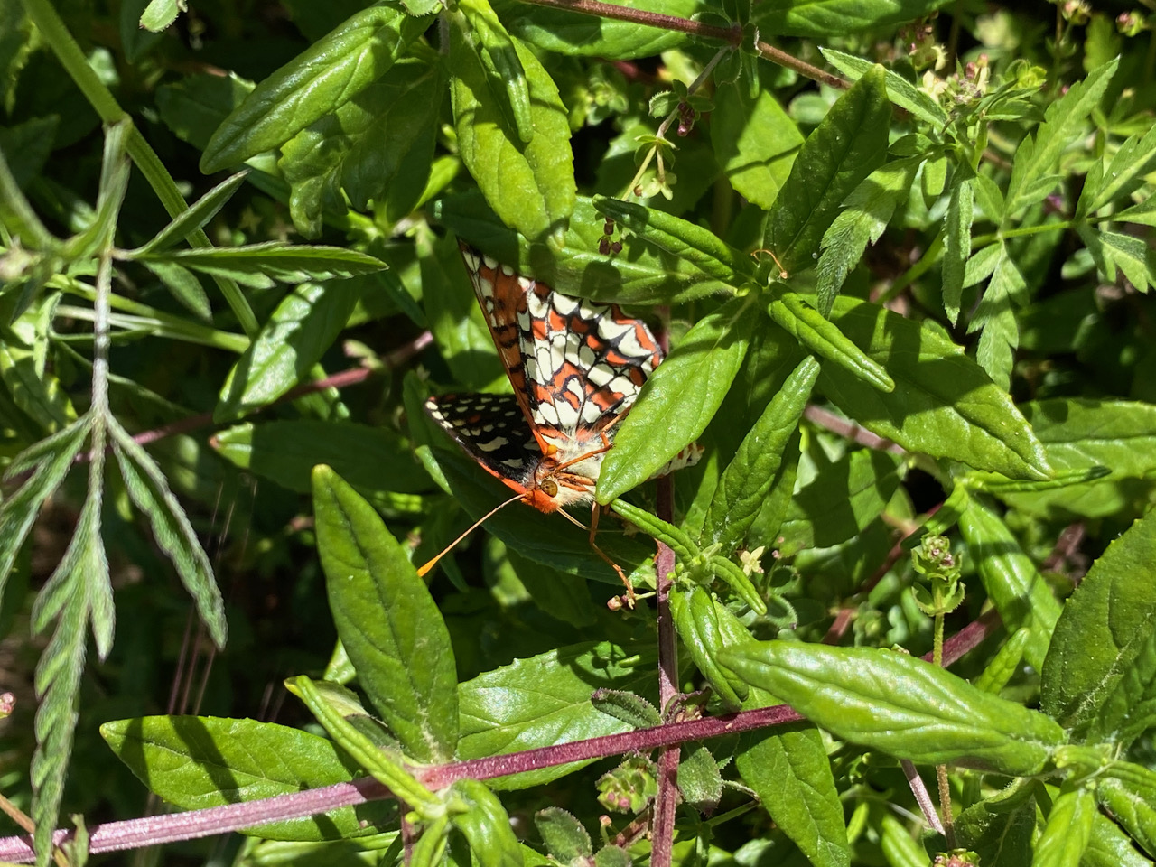 A freshly eclosed Variable Checkerspot butterfly is struggling in the undergrowth vegetation on the ground, unable to lift off. I part the vegetation for it, but it still cannot fly from that angle. I finally lift it up in my hand and place it on top of a Sticky Monkeyflower bush. After some panicked scrambling, the butterfly finally flies off unsteadily. Many accidents can happen at butterfly eclosure (the emergence of an insect from a pupa case). Often the newly emerged butterfly falls off its perch while expanding its wings, or worse, it can have its wings damaged in the process. This individual seems to have perfect wings – hopefully it will go on to live a good long life!