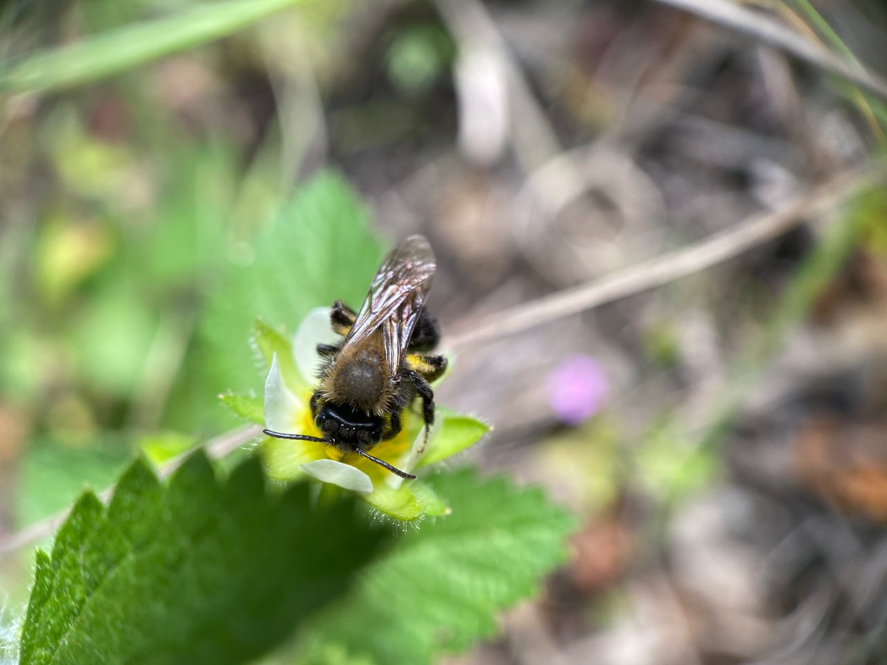 A Mining Bee, Andrena sp. (family Andrenidae) is foraging on a Sticky Cinqefoil flower.