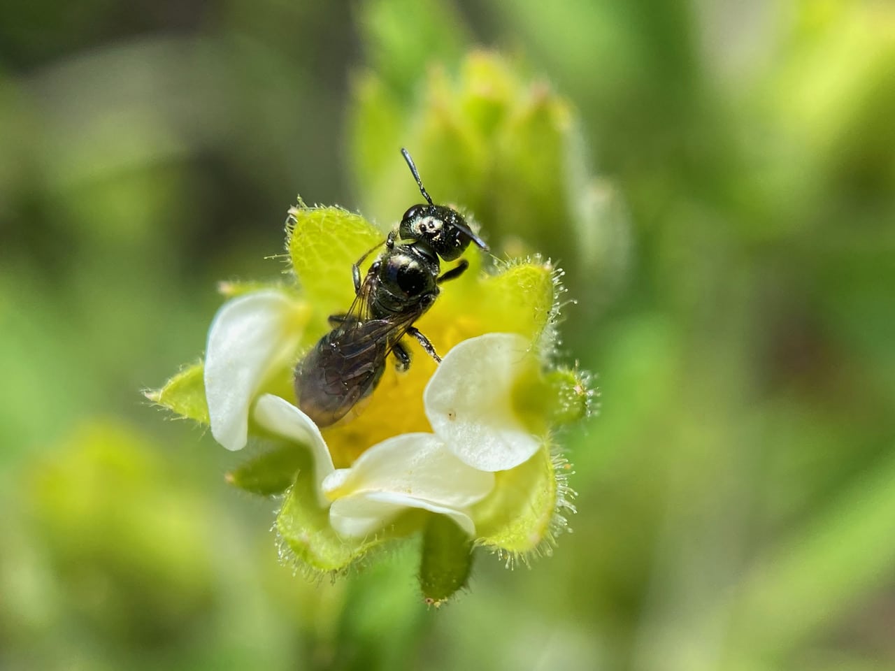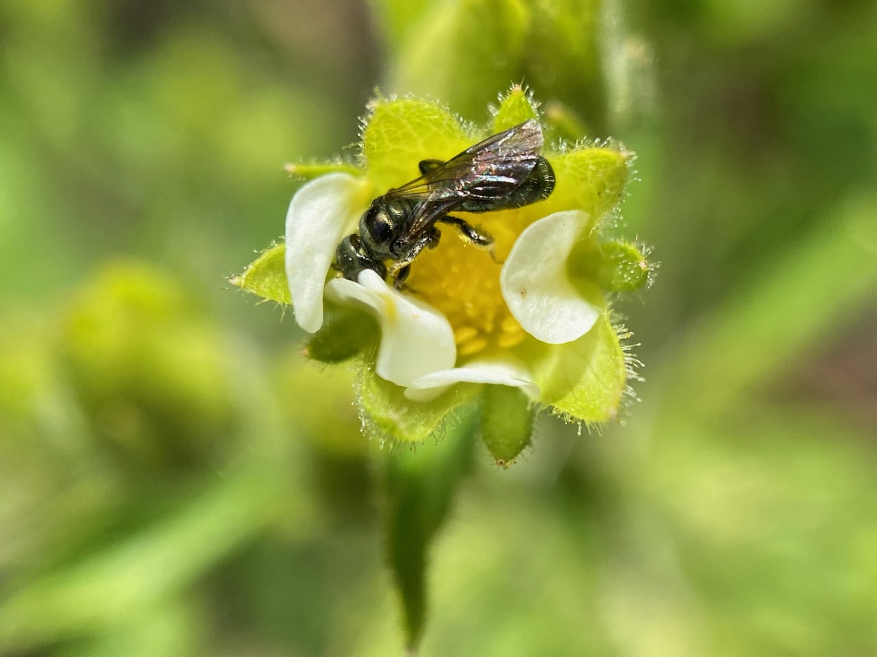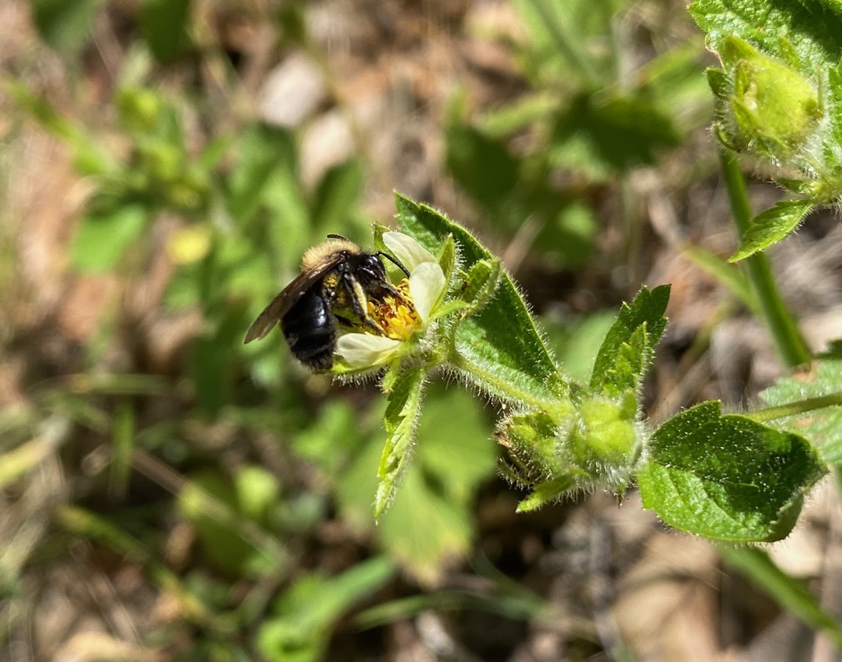 A glossy black bee with sparse hairs on her body visits a flower of Sticky Cinquefoil, Drymocallis glandulosa.