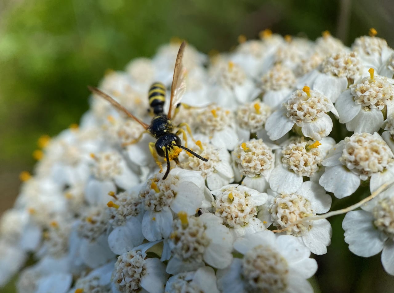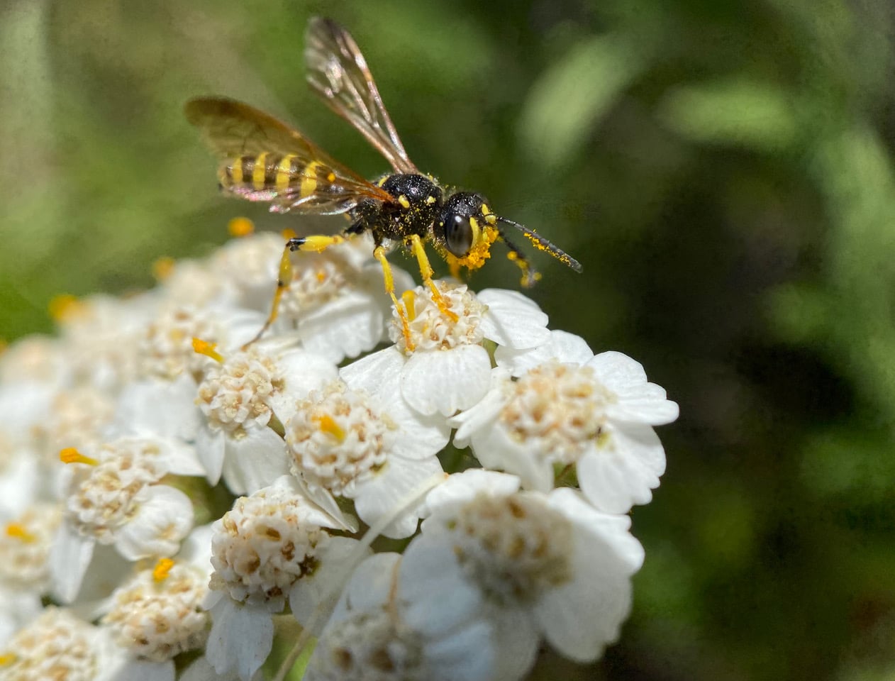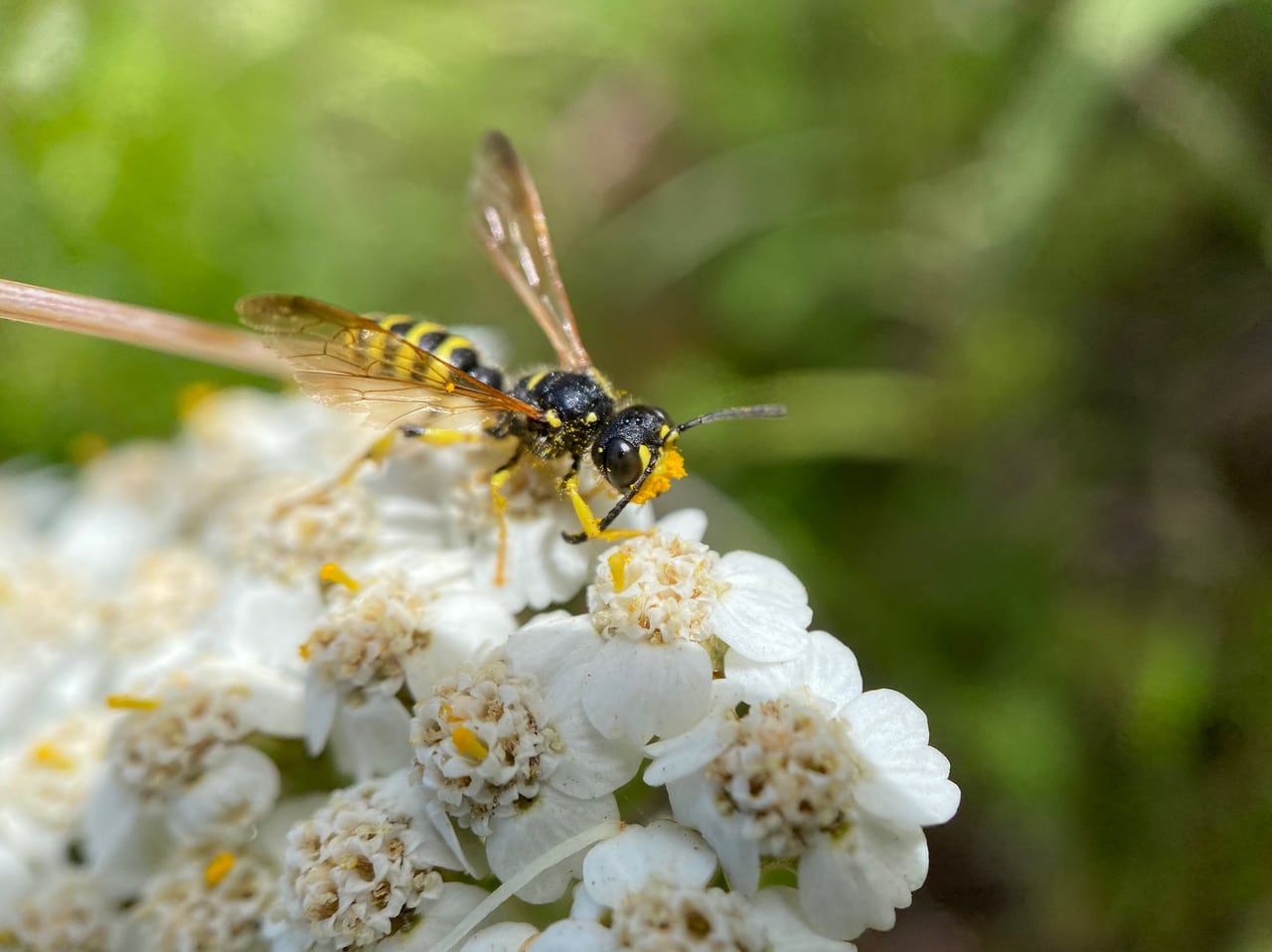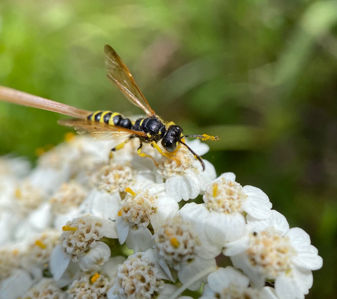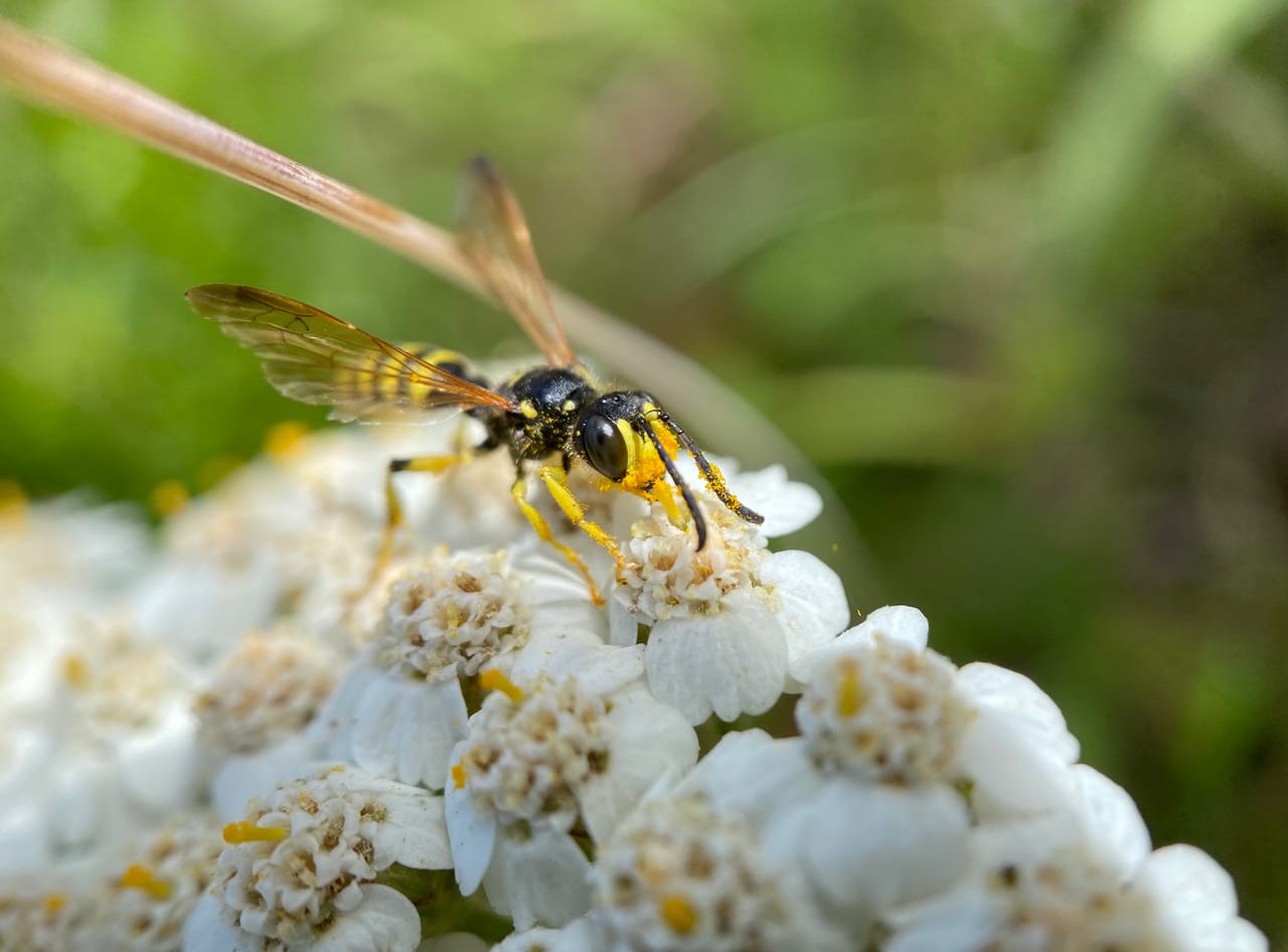 Its tongue extended, the Weevil Wasp is drinking nectar from the Yarrow flowers.