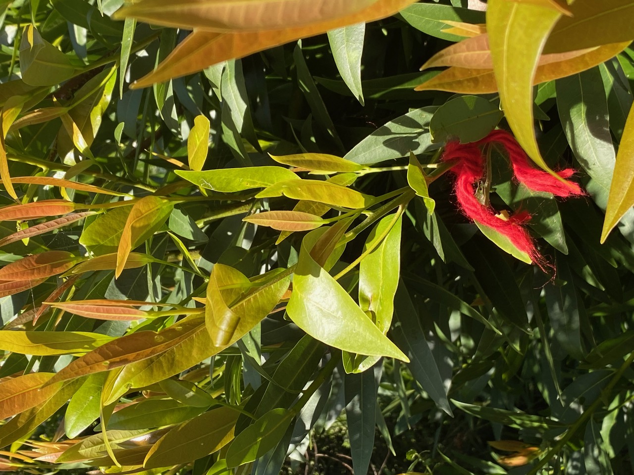 Before I enter the cattle gate at the Steam Train entrance to Skyline Gardens, I pause at the large bushy California Bay Tree, Umbellularia californica. It has put on many tender new leaves, some of which have been folded into these charming triangular boxes. I know from past observations that these are created by a small moth caterpillar.