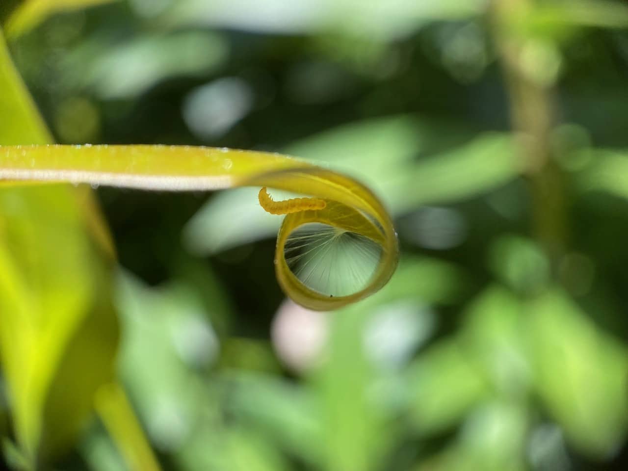 I bend the branch so I have a better look at the rolled tip. What a jaw-dropping sight! A tiny caterpillar is hard at work constructing a leaf shelter. Swinging its head up and down, it is alternately attaching silk to the upper surface of the roll and the flat undersurface of the leaf. And look at the radiating silk that it has created to roll the tip to start with! How can a little caterpillar produce so much silk?!