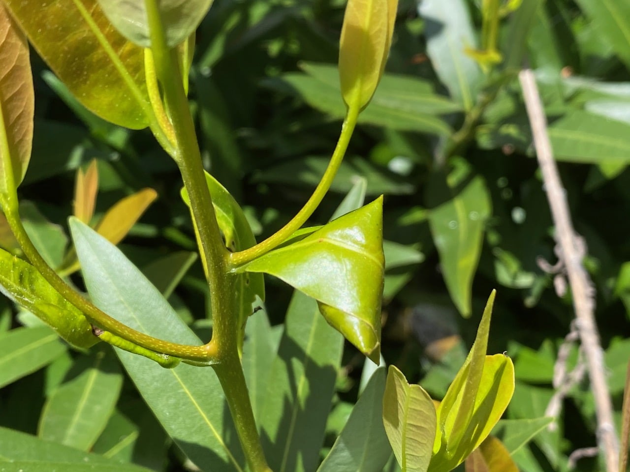 Then I notice a young leaf that has its tip loosely rolled. Might this be the beginning of a triangular box – a work in progress?