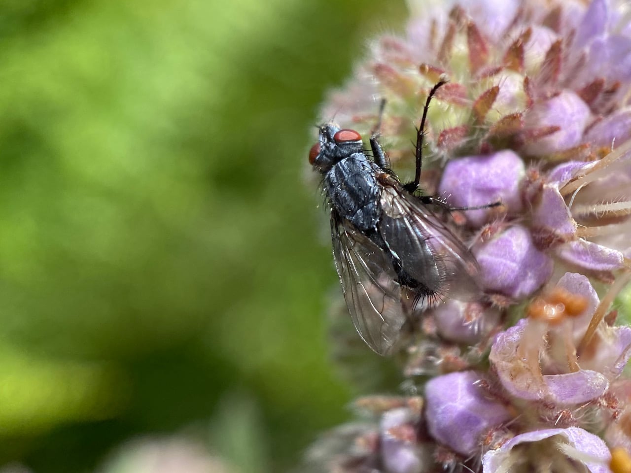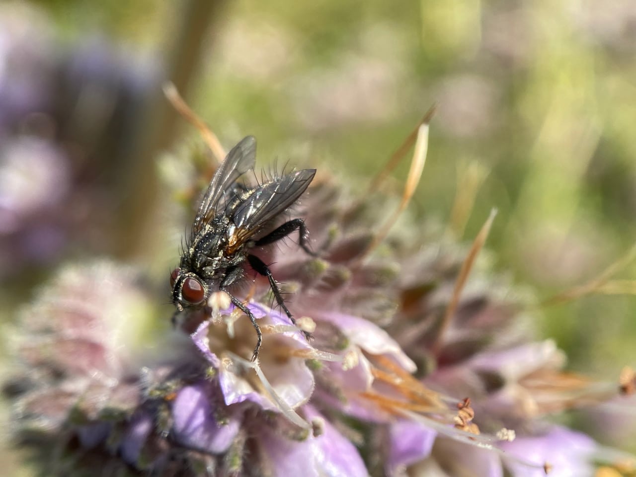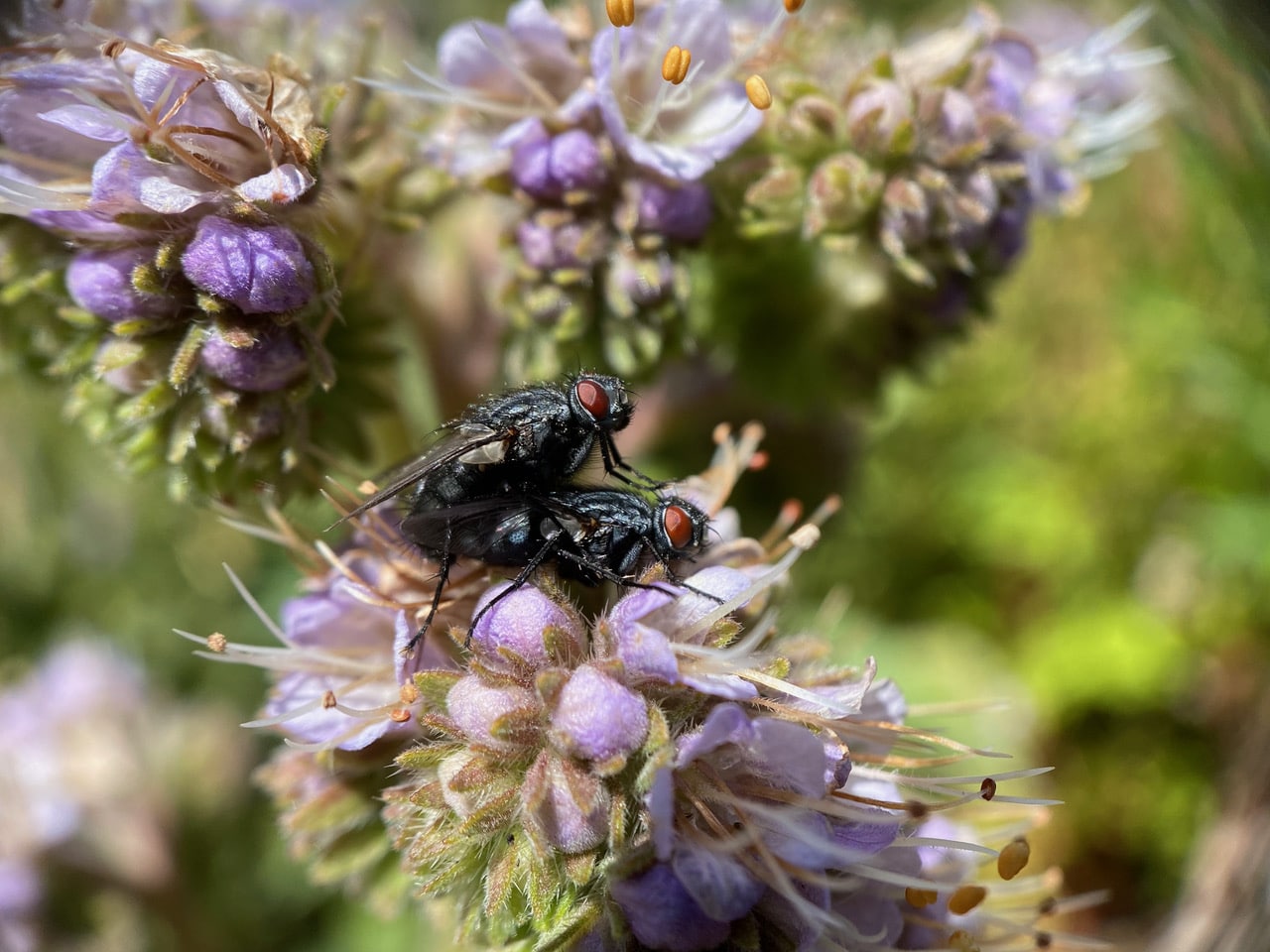 A pair of Blow Flies, Bellardia sp. (family Calliphoridae) has chosen a beautiful spot among Phacelia flowers for their nuptial union.