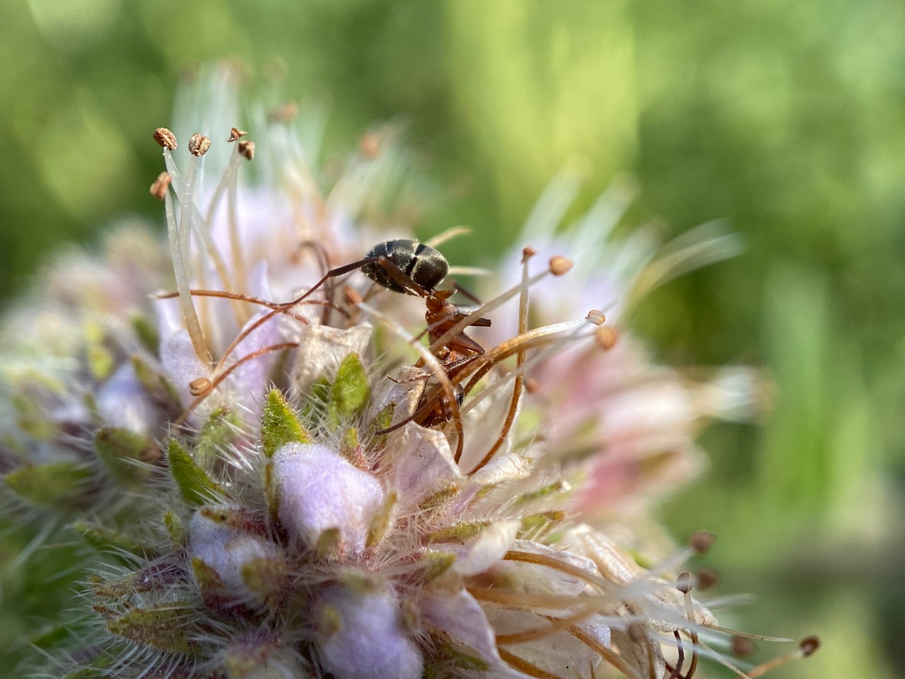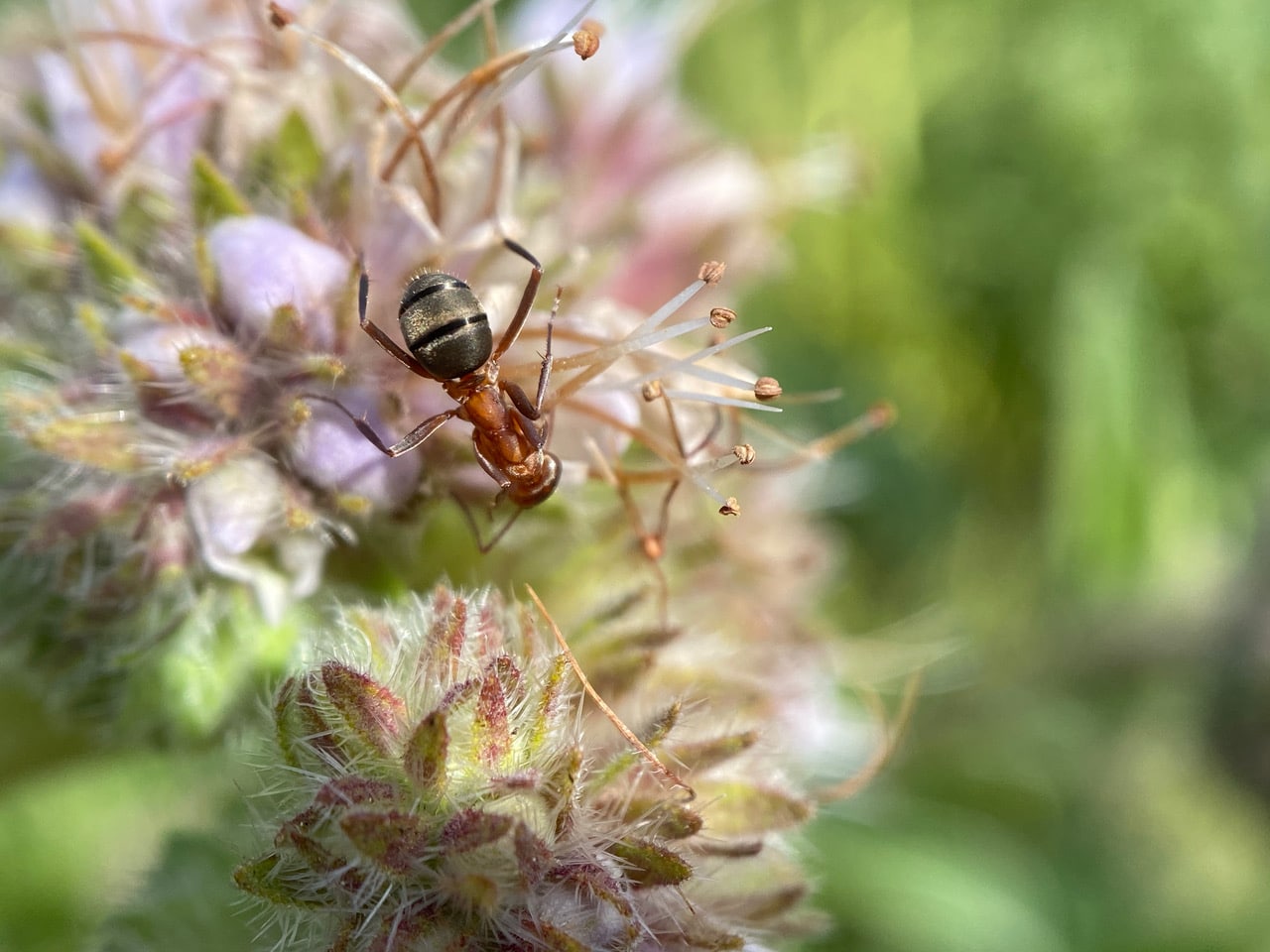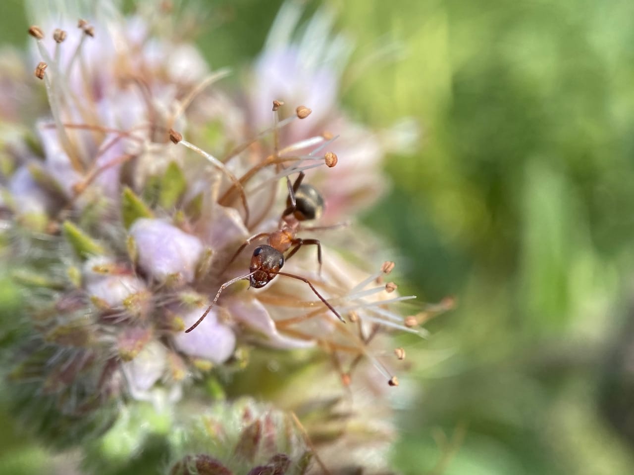 A large, bicolored ant is foraging on the flowers of California Phacelia. Easily confused with our other bicolored species, the Carpenter Ants, it is actually a Fusca-group Field Ant, Complex Formica fusca.