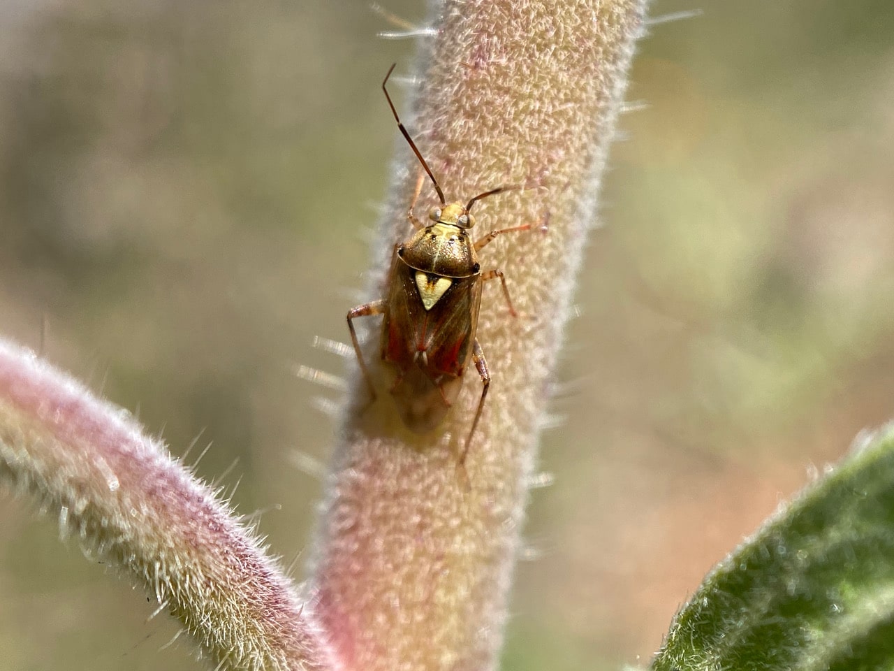 From a distance, I see a bright flash of gold on a stem of California Phacelia. The golden shine dissipates as I get closer, resulting in this photo of a Western Tarnished Plant Bug, Lygus hesperus (family Miridae). The wings simply won’t focus in this light. The resplendent bug makes its way up the stem and climbs onto an inflorescence.