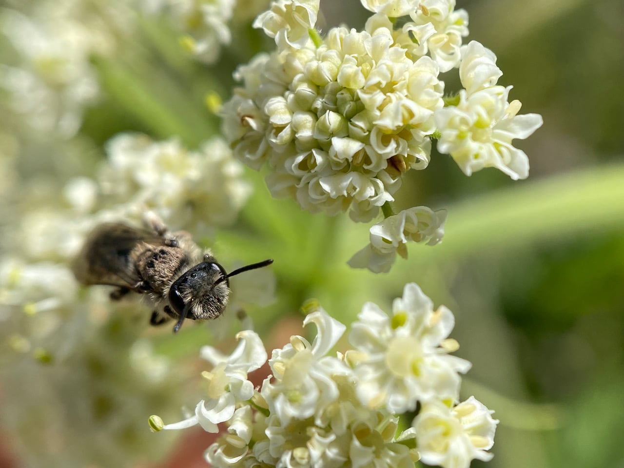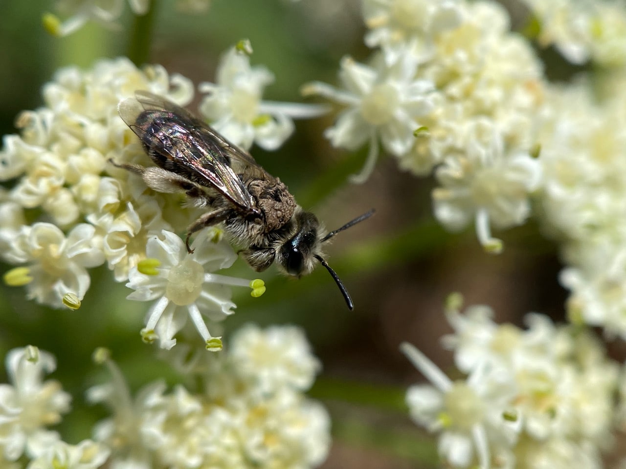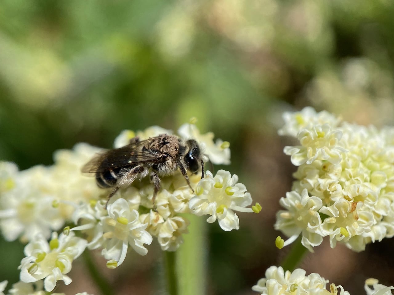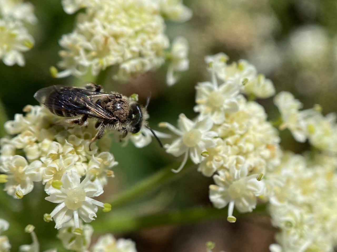Andrena is one of the largest bee genera in the world. The floral preferences of Andrena species span the range of bee diets; some are broad generalists, and a number are strict specialists. Andrena are among the first bees to fly in the spring; their ability to withstand the chill is still a puzzle to scientists. The bees can’t fly until their body temperatures reach 50-60 F. They rely on the warmth of the sun to get them to speed, and it is not uncommon to see them warming up on leaves or rocks. This cold-hardiness makes Andrena excellent pollinators of early spring wildflowers and cultivated crops.