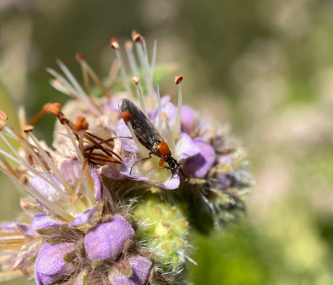 A female March Fly, Dilophus sp. (family Bibionidae) is foraging on the flowers of California Phacelia.