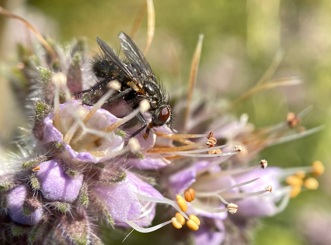 A Blow Fly, Bellardia sp.(family Calliphoridae) is roaming over an inflorescence of California Phacelia.