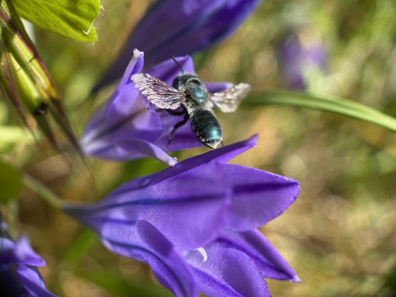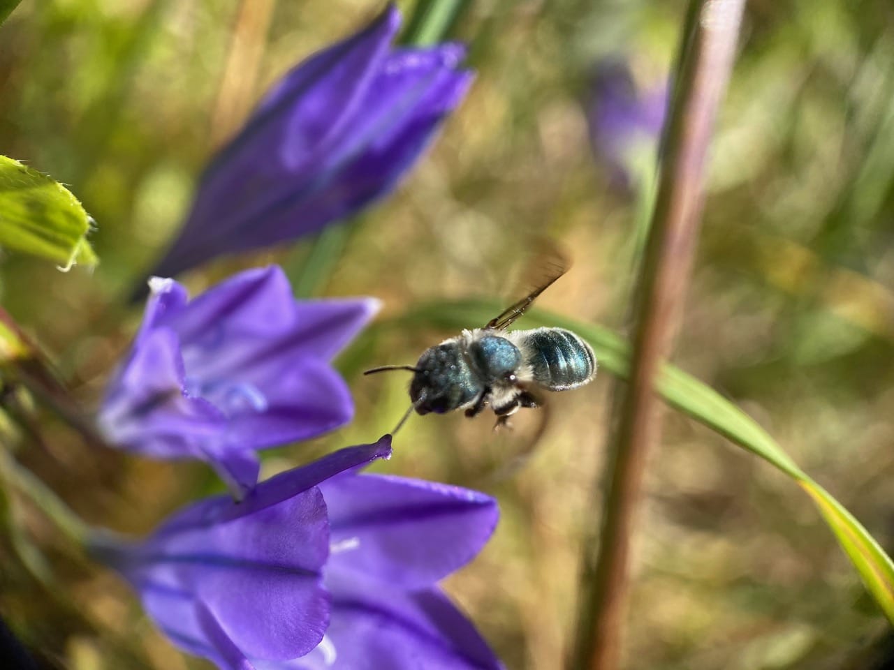 Back at the patch of Ithuriel’s Spear, the iridescent Mason Bees, Osmia sp. are still busy flying in and out of the trumpet-shaped flowers.