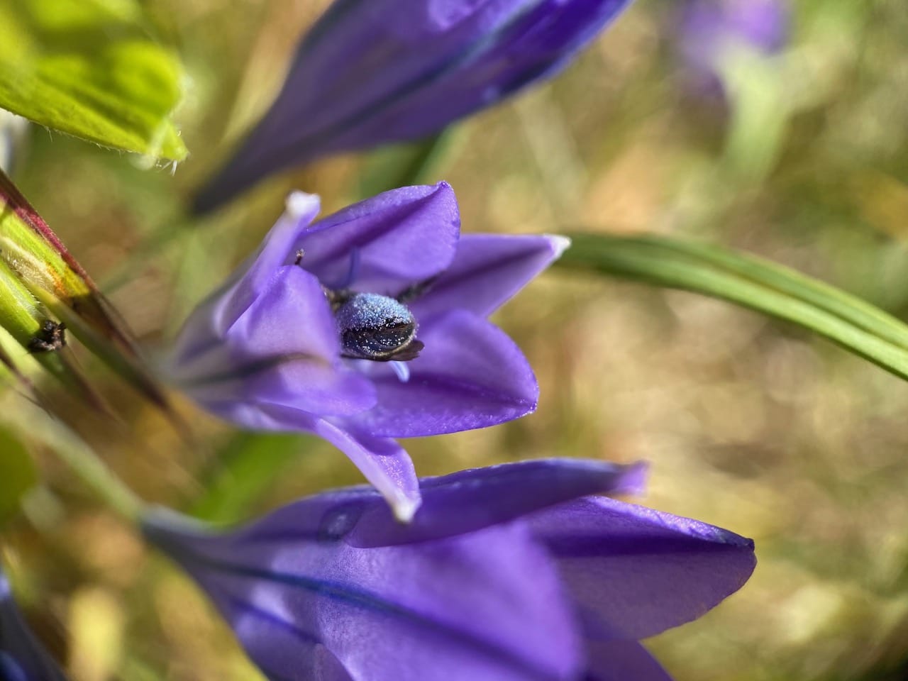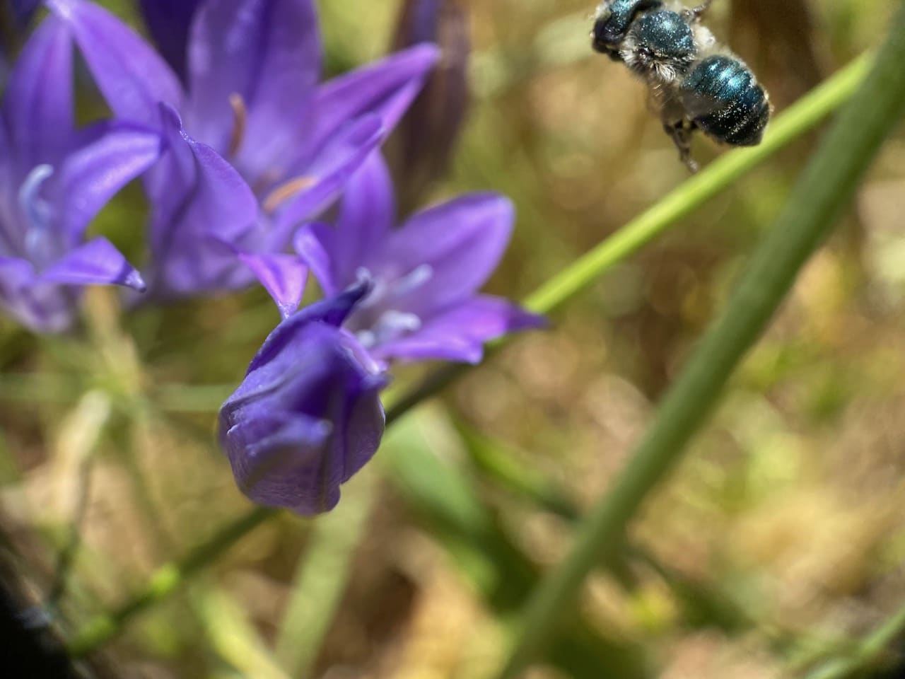 In the glare of the afternoon sunlight, I see numerous dark, bluish bees buzzing around the Ithuriel’s Spear flowers. They are fast and frenetic. By their behavior, size, shape and color, I figure they might be Mason Bees, Osmia sp ?