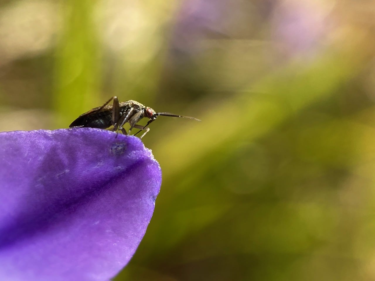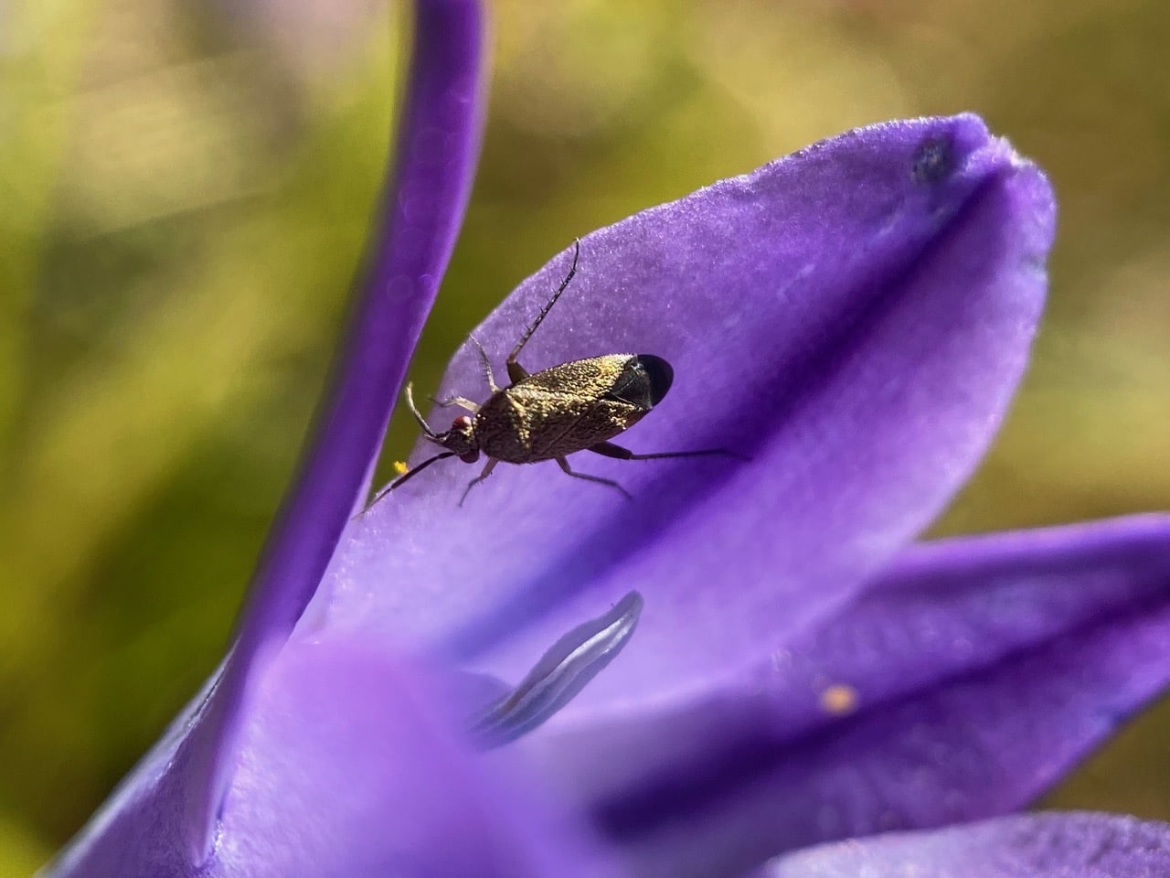 The Black Grass Bug climbs to the top of an Ithuriel’s Spear petal. Note its needle-like piercing-sucking mouthpart visible in this angle.