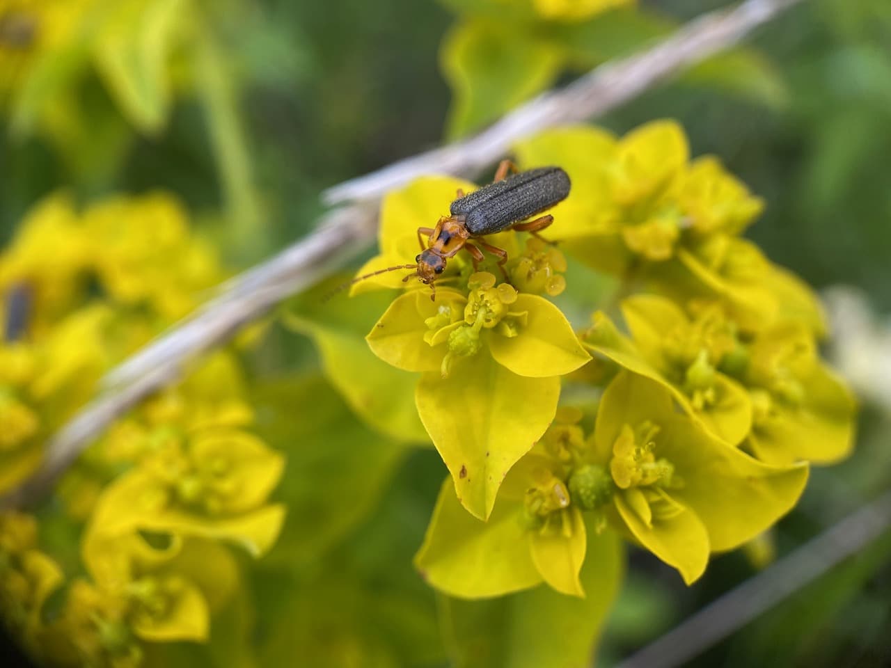A Soldier Beetle, Cultellunguis americanus (family Cantharidae) is foraging on in inflorescence of Leafy Spurge.