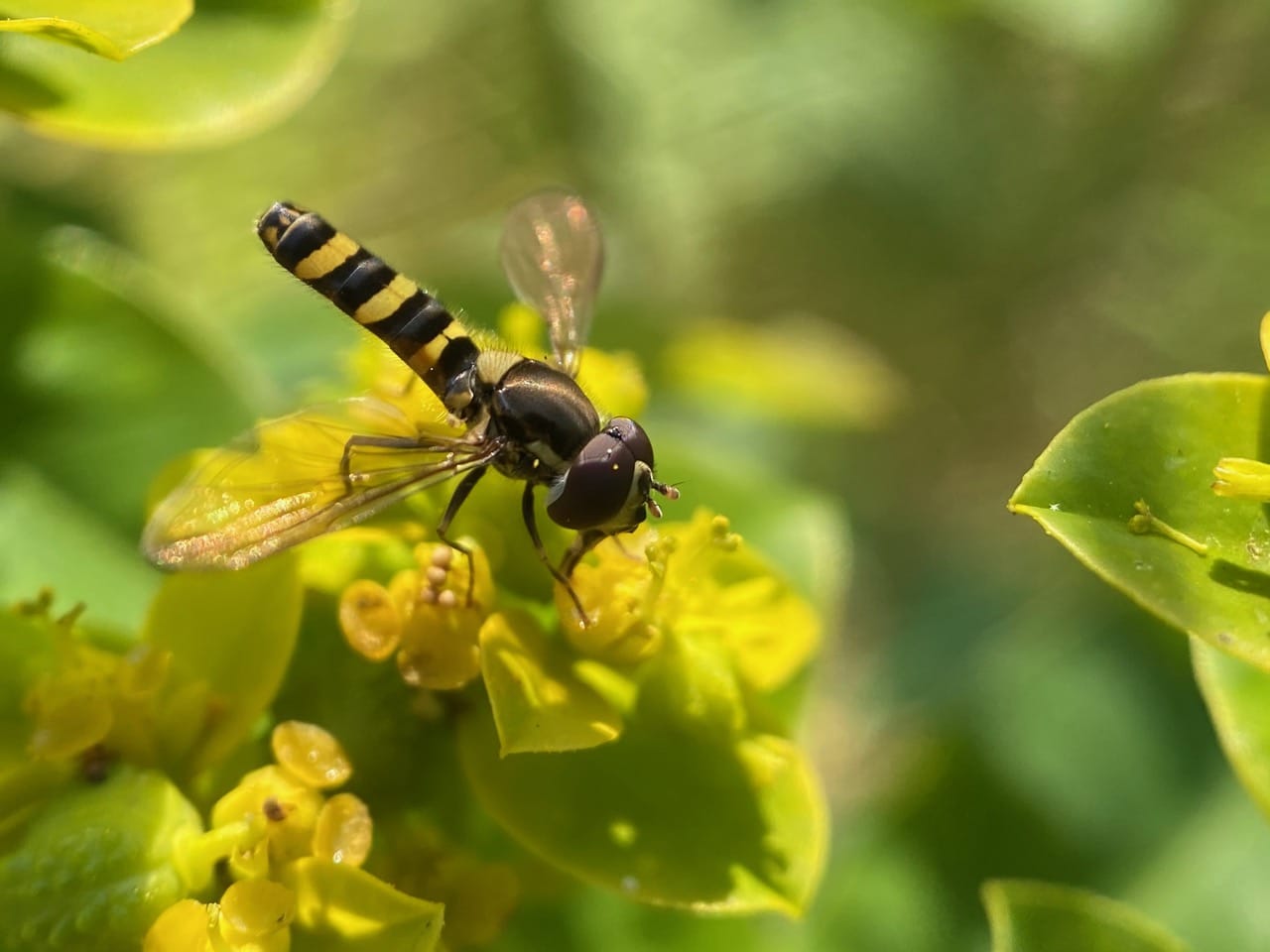 A male Diamond Spottail, Fazia micrura (family Syrphidae) forages on a flower of Leafy Spurge.