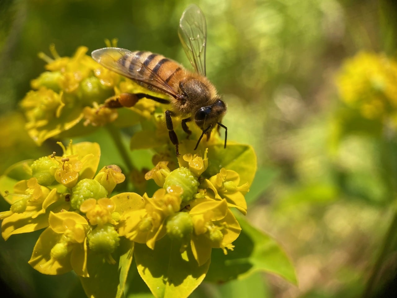 A Honey Bee, Apis mellifera (family Apidae) is taking nectar on an inflorescence of Leafy Spurge.