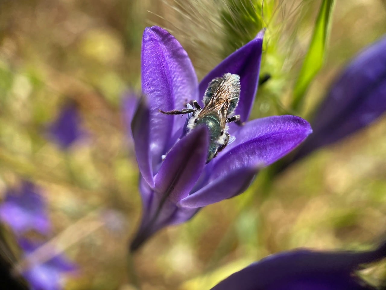Note that the bee has sky-blue pollen of Ithuriel’s Spear in the scopa of her hind leg. The scopa appears to extend from the femur to the tibia.