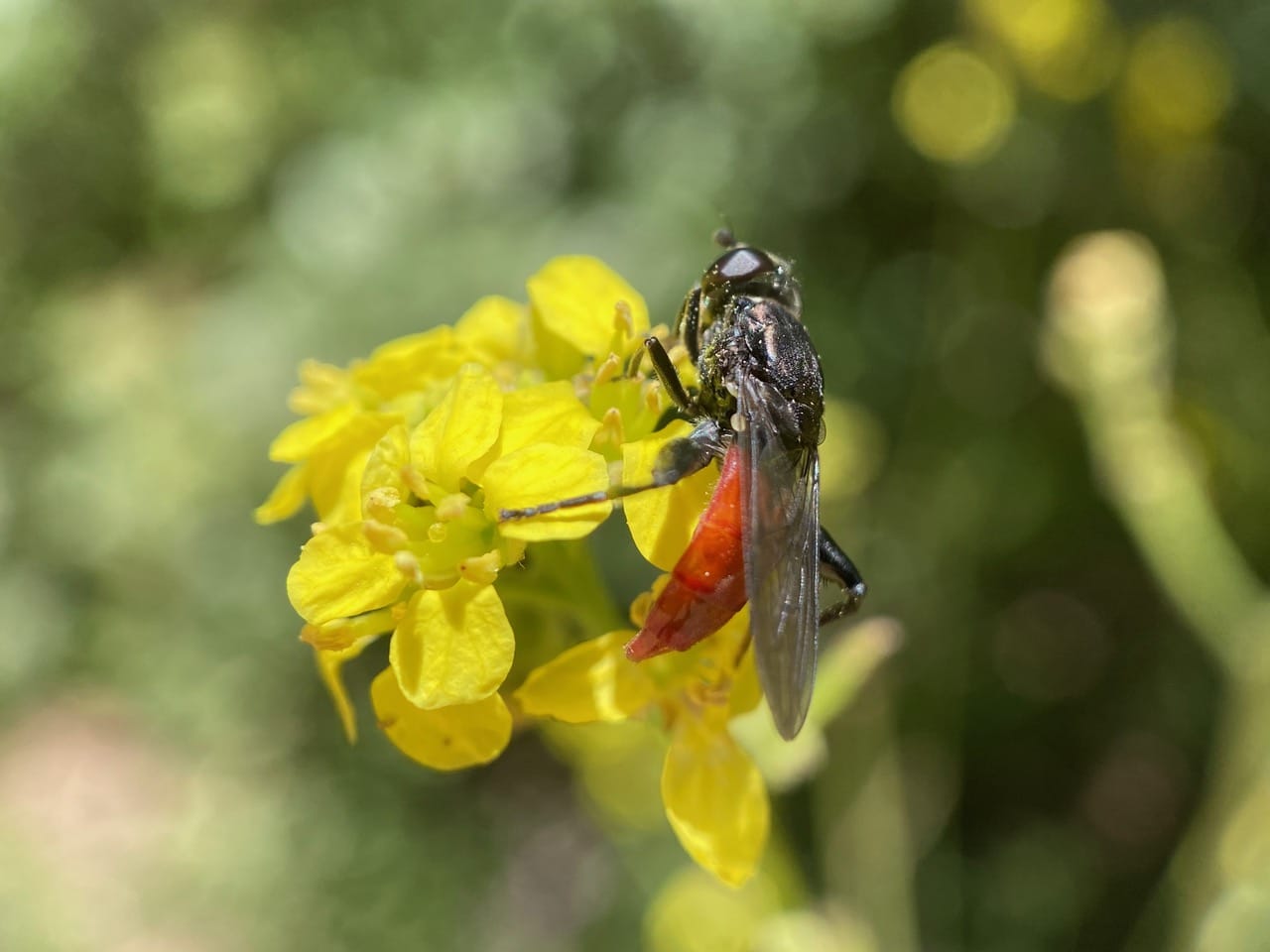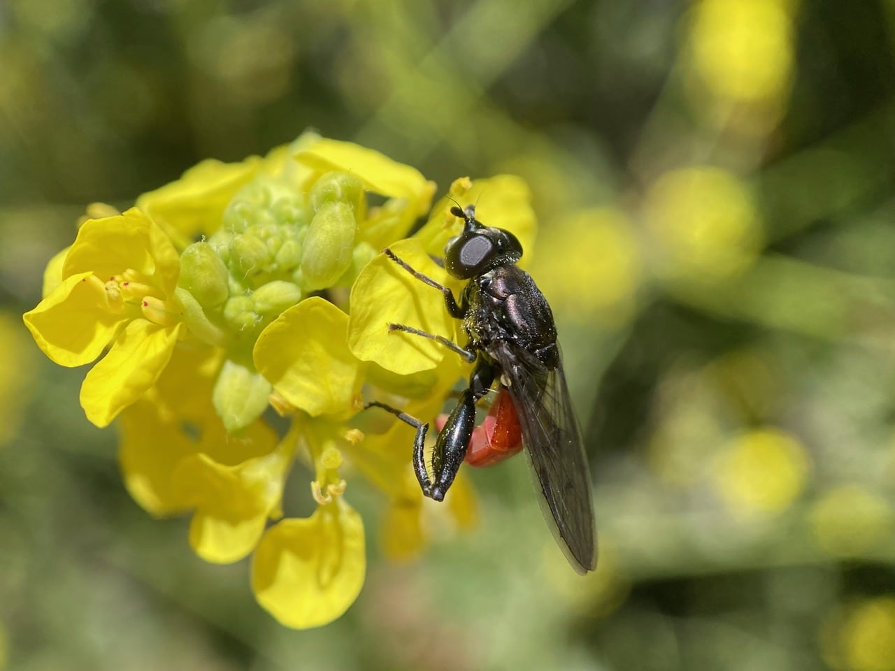 As soon as I spot this insect on the Wild Mustard flowers, I know that it is a hover fly that I have never seen before. Note the bright red, curled abdomen, and the enlarged femur and bowed tibia. iNaturalist has helped identify it as the Short-haired Leafwalker, Chalcosyrphus piger (family Syrphidae).