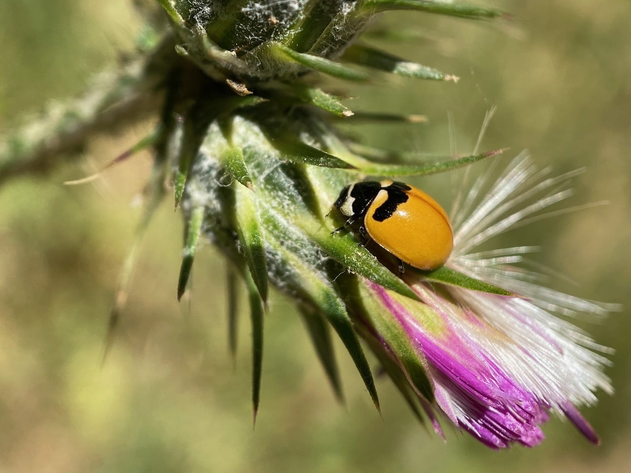 A Pacific Three-banded Ladybeetle, Coccinella trifasciata subversa (family Coccinellidae) is resting on an immature flowerhead of Italian Thistle.