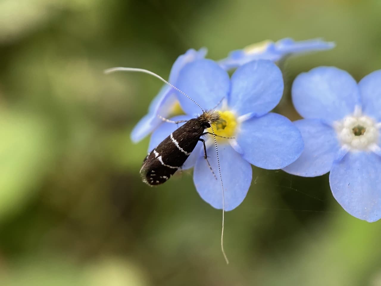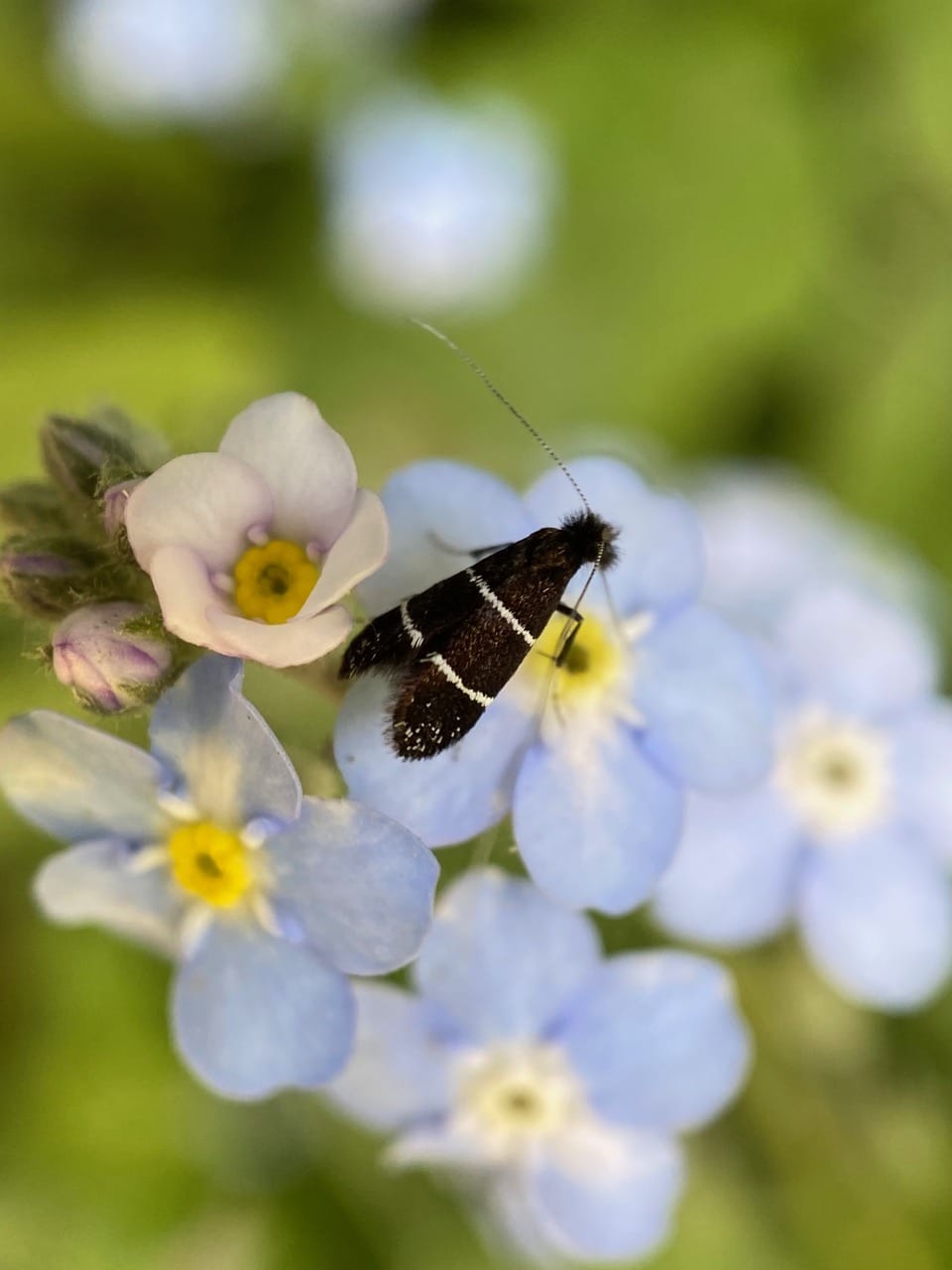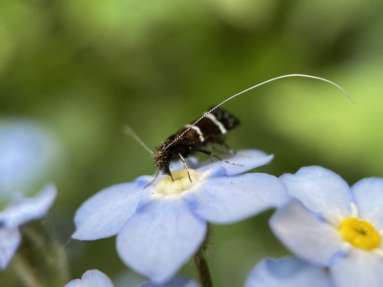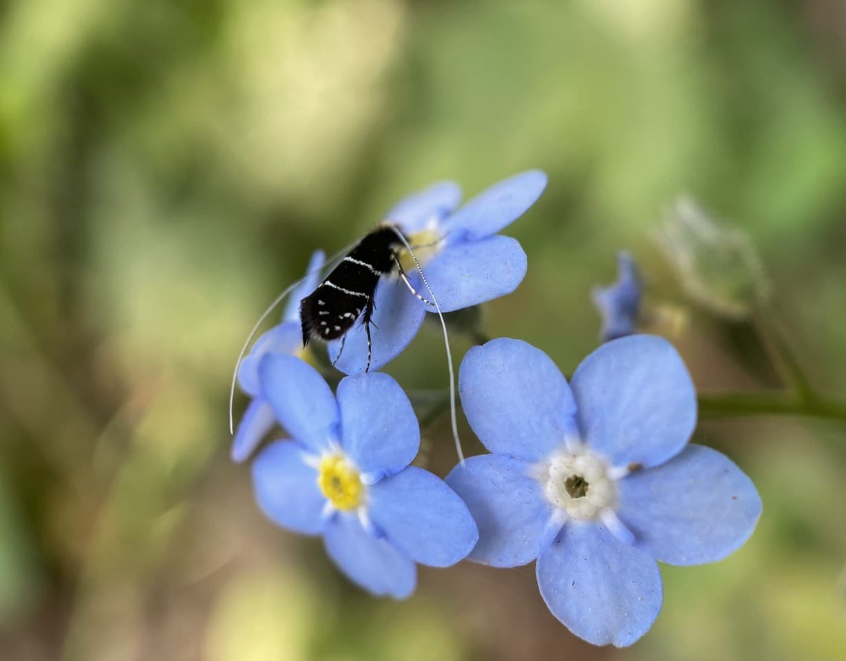 Some of the Ocean Spray Fairy Longhorn Moths are nectaring on the exotic Forget-me-not flowers, Myosotis sp. There are few native wildflowers in bloom along the trail now. I am glad that the insects are adaptable enough to make use of the available floral resources offered by the non-native species.