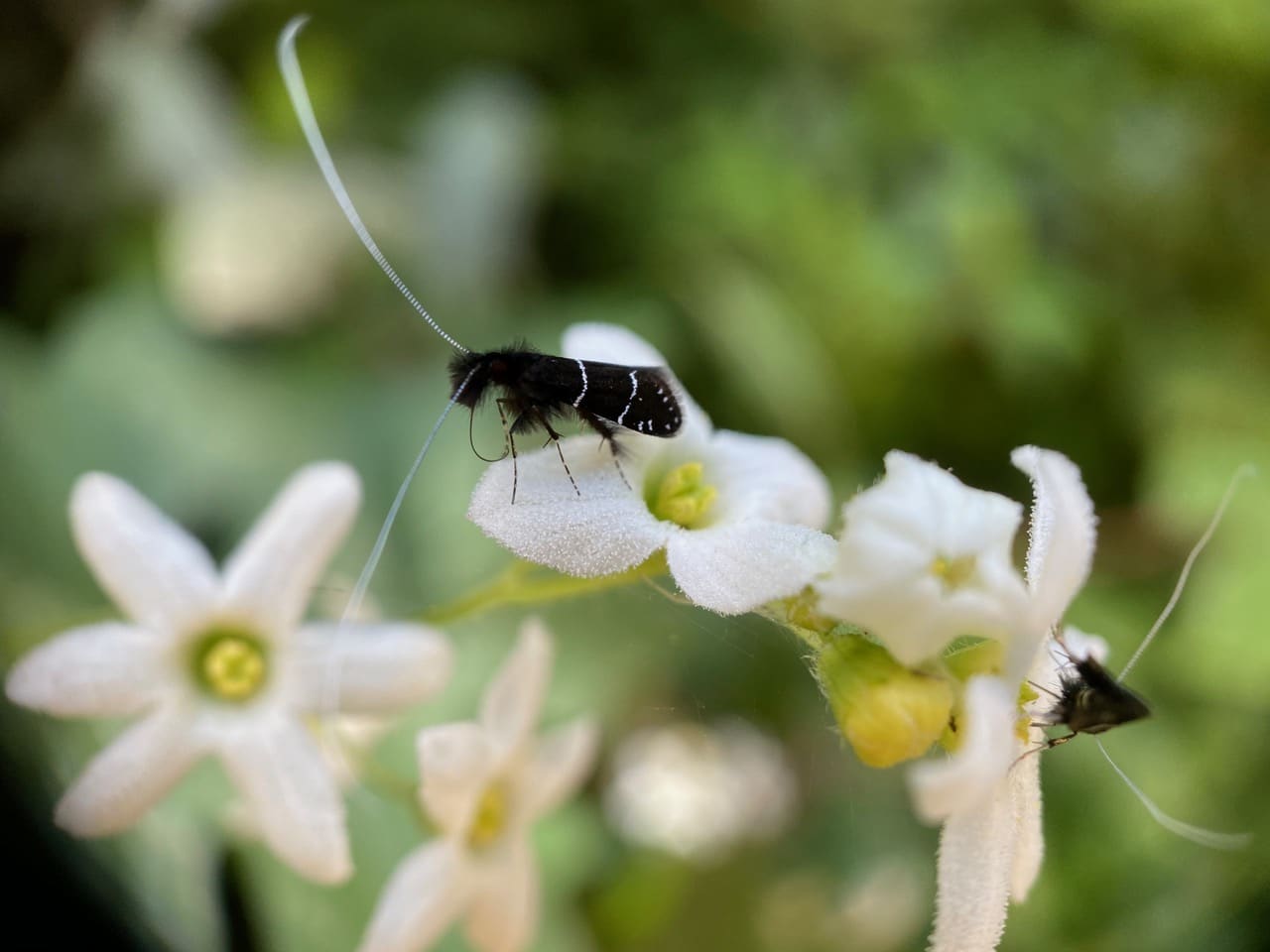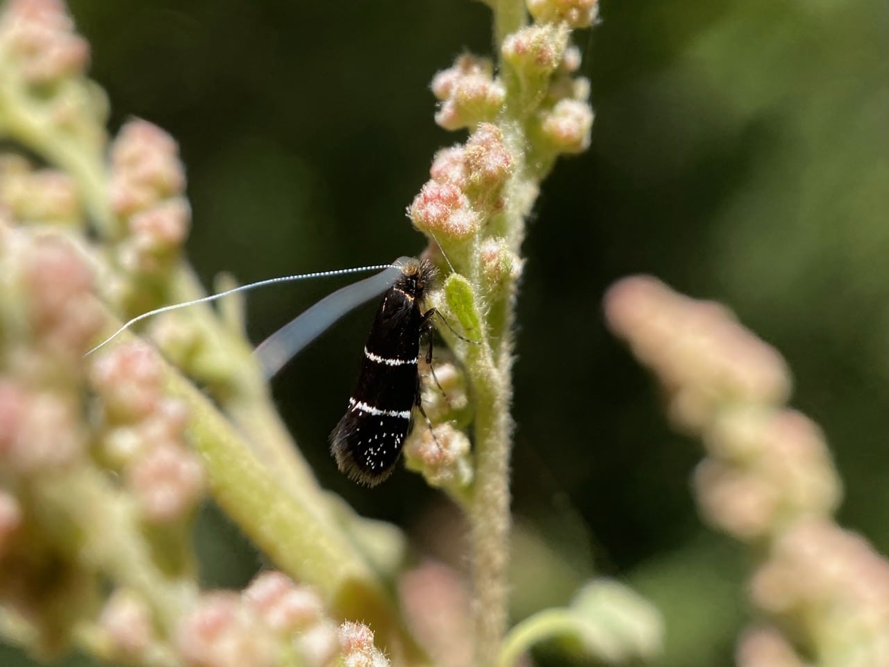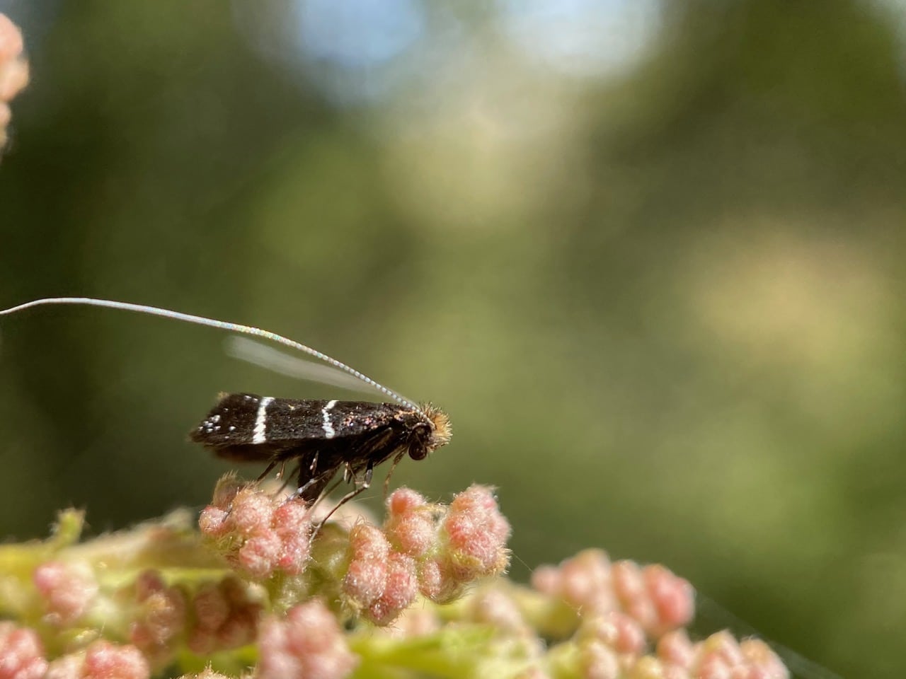 Note the long antennae for which the moths get their common name “longhorn”. The males sport longer antennae, and the white antennae apparently feature prominently in their aerial courtship display.