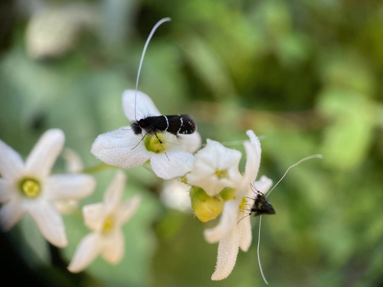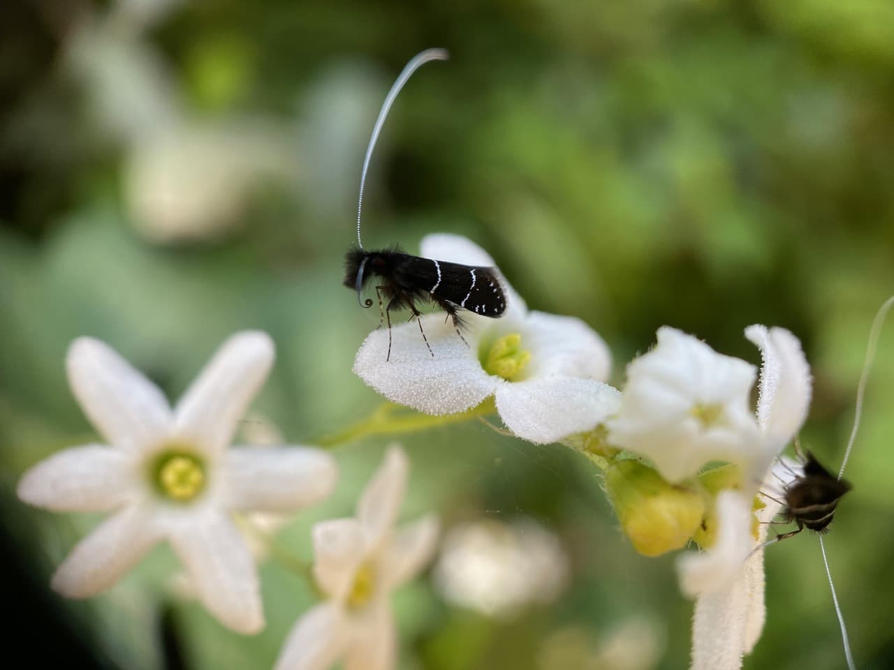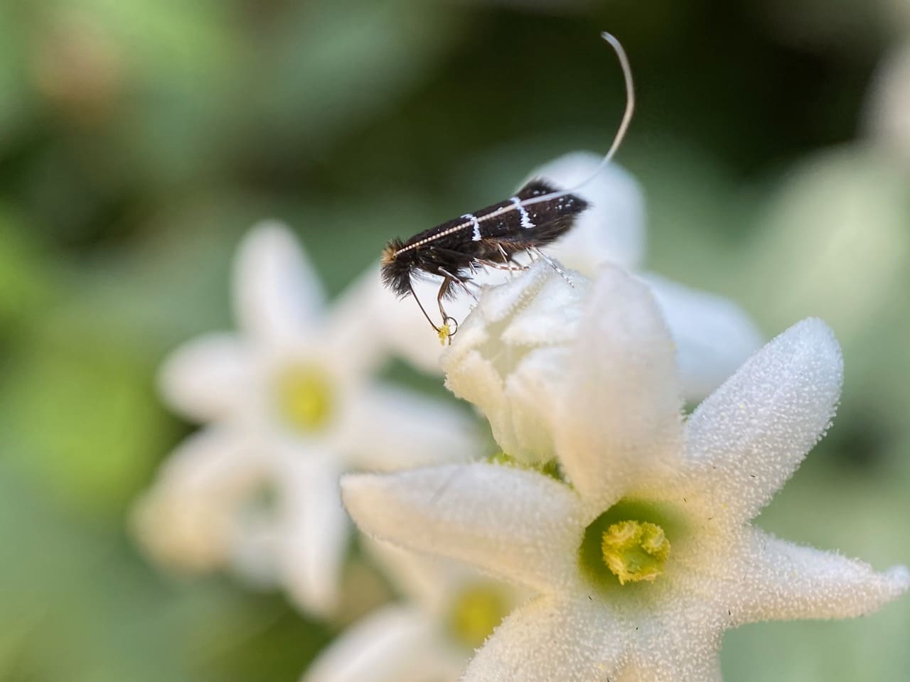 Note the long antennae for which the moths get their common name “longhorn”. The males sport longer antennae, and the white antennae apparently feature prominently in their aerial courtship display.