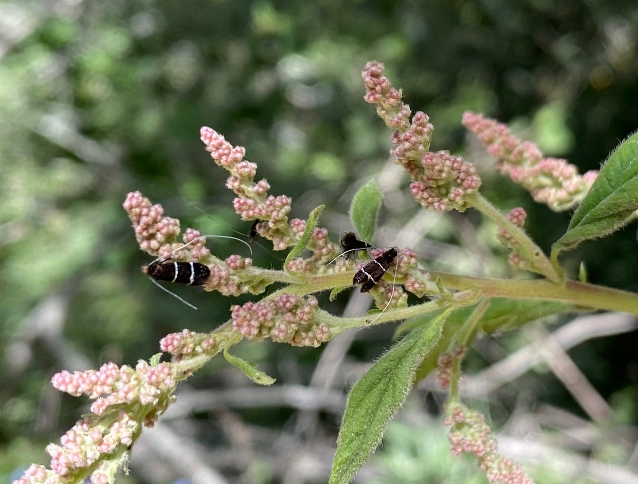 Her abdomen curled forward, a female Ocean Spray Fairy Longhorn Moth is laying eggs among the flower buds of Ocean Spray, the larval food plant for the species.