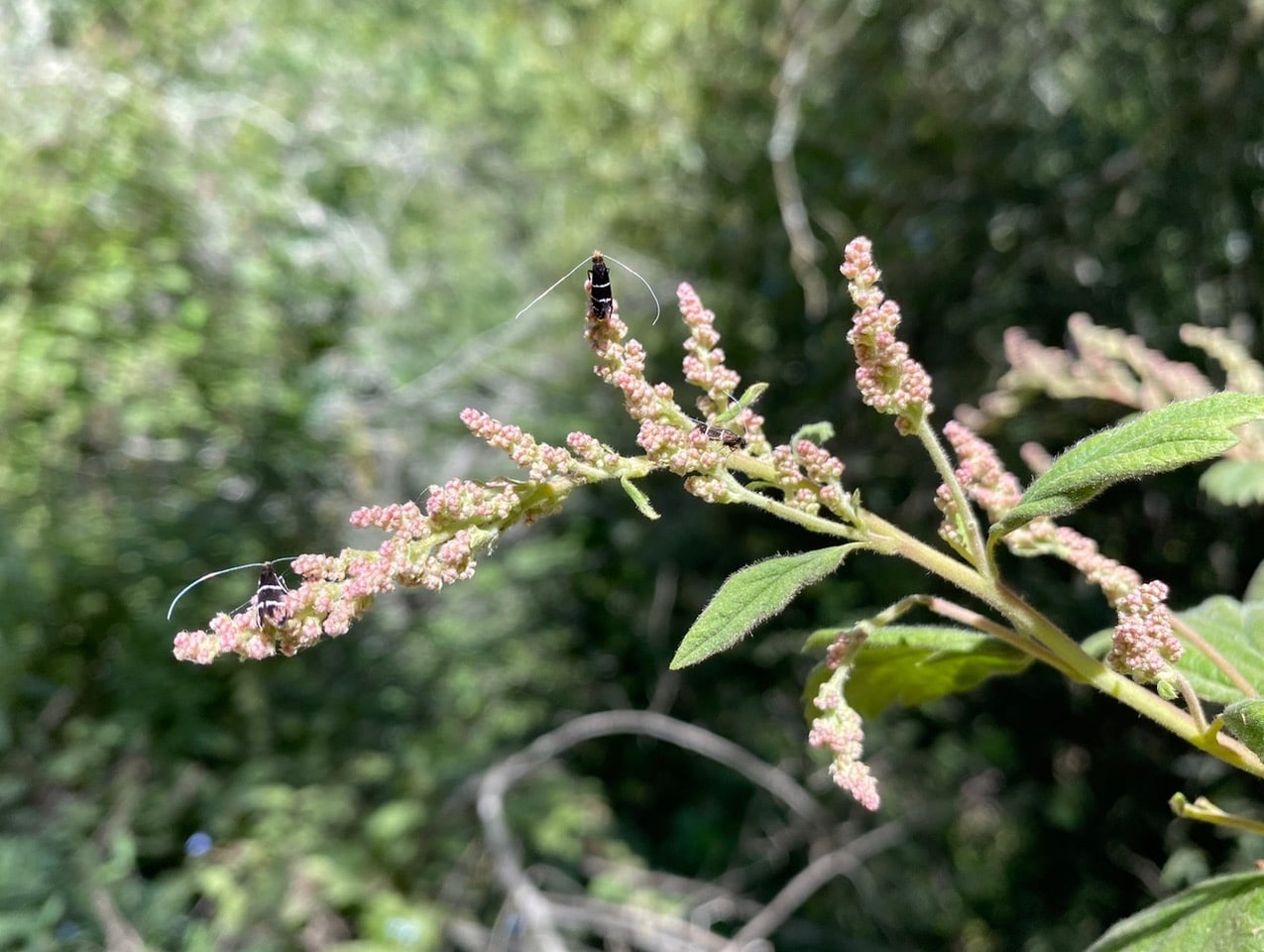In Adela septentrionella, males gather to perform courtship dances – bobbing flights above the branches of Ocean Spray about ready to burst into bloom. While the display may appear peaceful and romantic, studies have shown that males actually engage in combat using long tibial spurs during flight displays and while landed on leaves. They apparently attempt to fray one another’s wings and also kill rivals. Females, with orange hairdo and shorter antennae, watch the male displays, often upwind, from 15-20 feet away. Females may be releasing a pheromone that tells the males they are being watched and that intensifies male-male combat. Females eventually fly into the male swarm and engage in evasive flight; the least damaged male would be the most likely to capture her. Mating occurs below the mating swarm, in plain view, without interference. Fertilized females fight over the most sun-exposed Ocean Spray unopened flower inflorescences on which to lay their eggs.